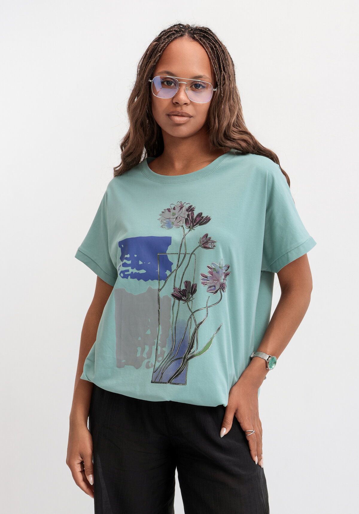 Блуза из хлопка с цветочным принтом. Короткий рукав, круглый вырез горловины, кулиска по низу. Модель представлена в шести цветах: черный, белый, мятный, бежевый, розовый, голубой.