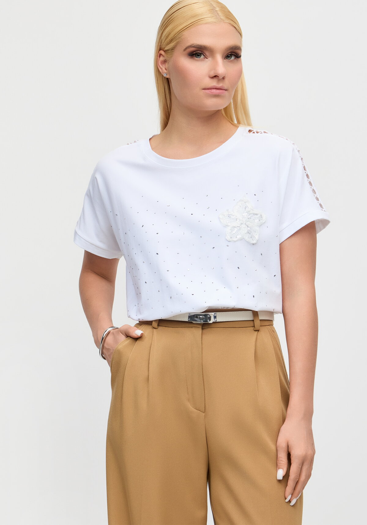 Изящная блуза из мягкого хлопка со спандексом — гармония комфорта и элегантности: натуральная ткань дарит приятные ощущения и отличную воздухопроницаемость, а эластичные волокна обеспечивают идеальную посадку по фигуре. Лаконичный круглый вырез и короткий рукав делают модель универсальной основой для самых разных образов, а утончённый декоративный цветок из ткани в сочетании со сверкающими стразами добавляют изысканный акцент. Эта блуза станет настоящей находкой для создания стильных повседневных и нарядных луков — она легко сочетается с юбками, брюками и джинсами, подчёркивая вашу индивидуальность и добавляя образу нотку очарования!