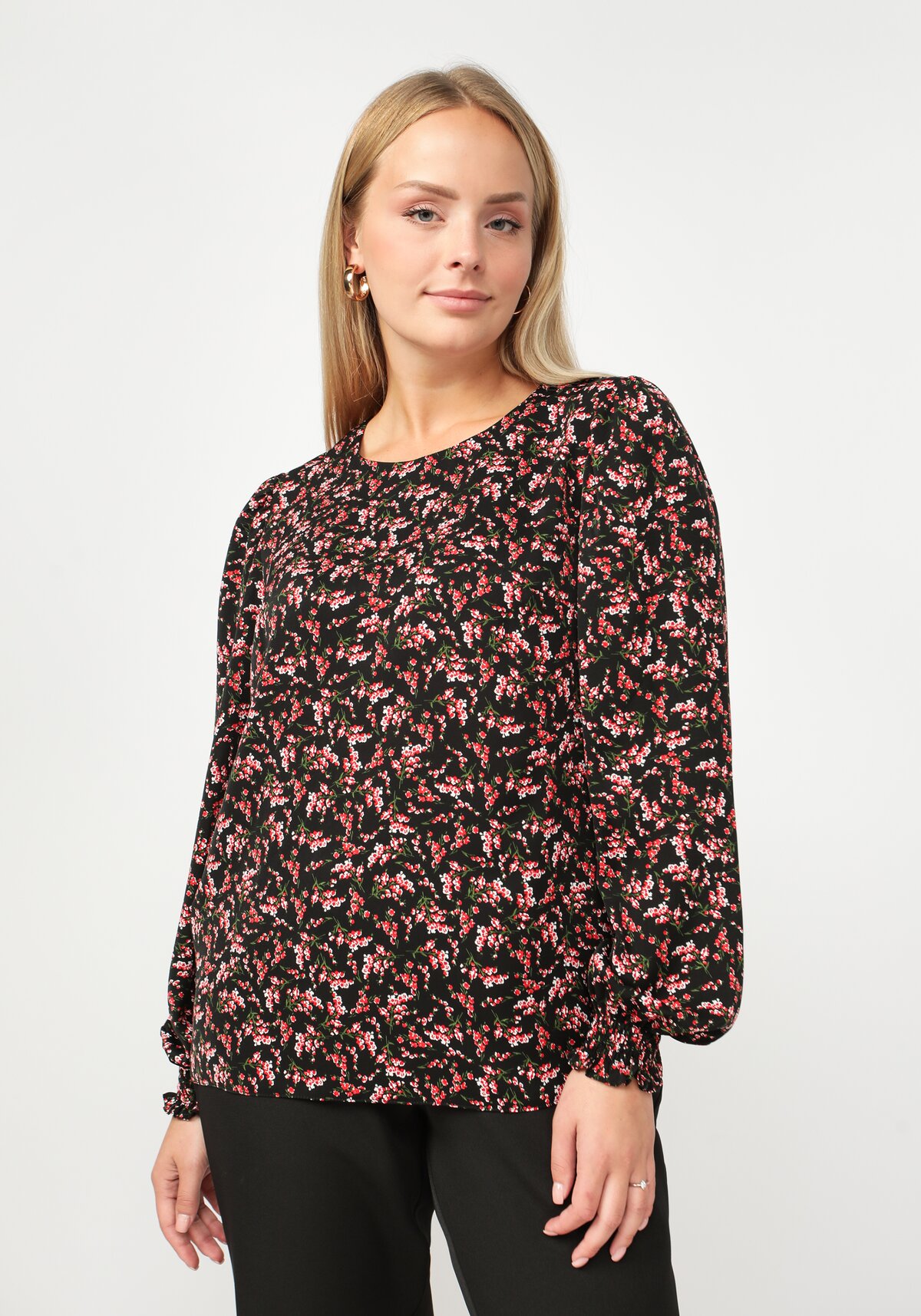 Очаровательная блуза с объемным рукавом на резинке и актуальным цветочным принтом. Идеально сочетается с однотонным низом разного фасона. Вискоза в составе. Широкий размерный ряд. Комфортная длина позволяет носить блузу как заправленной, так и навыпуск.