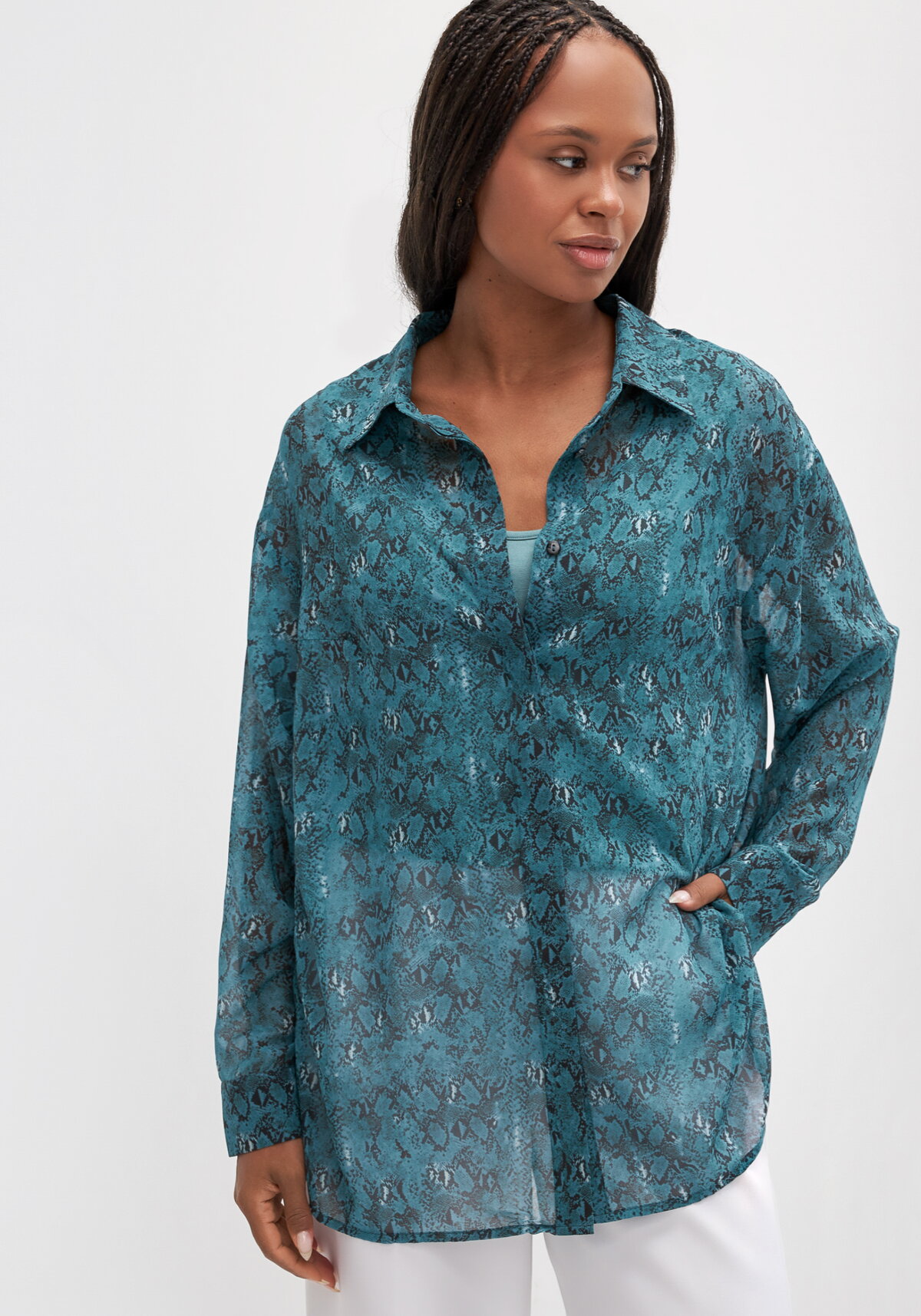 Утонченная блуза из струящейся ткани. Длинные рукава с широкими манжетами. Потайная застежка на пуговицы с планкой. В комплекте с блузкой идет майка в тон блузки. Благодаря лаконичному дизайну эта модель позволит создать множество образов в разных стилях.