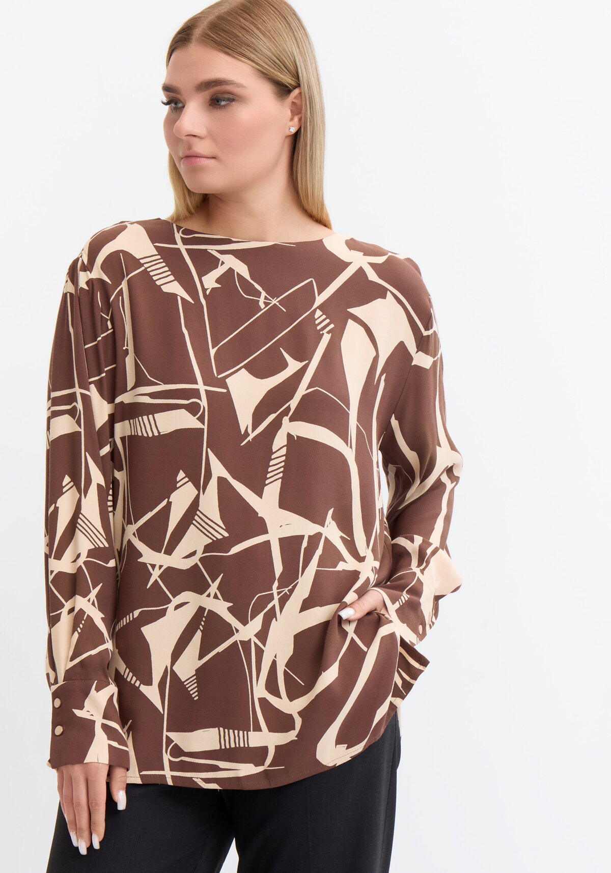Блуза прямого силуэта. Втачной рукав со спущенным плечом. Широкая манжета с акцентными пуговицами. Разрезы в боковых швах. Застежка на пуговицу по спинке. Создайте нарядный образ, дополнив модель классическими брюками и яркими аксессуарами.