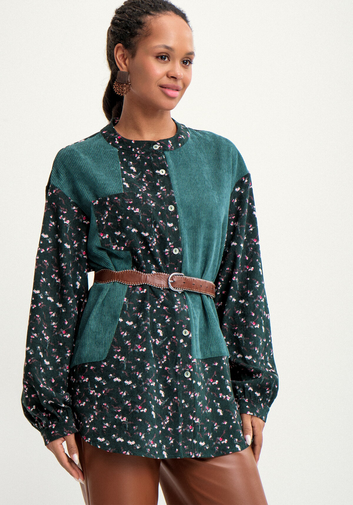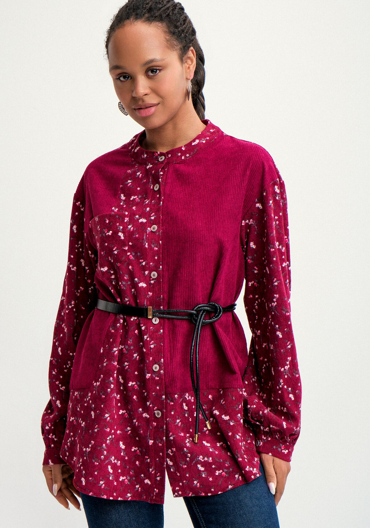 Комбинированная рубашка А‑силуэта. Стойка‑воротник и планка на пуговицах придают модели лаконичность, а накладной карман добавляет функциональности. Приспущенный рукав полной длины с манжетой создает непринуждённый силуэт.