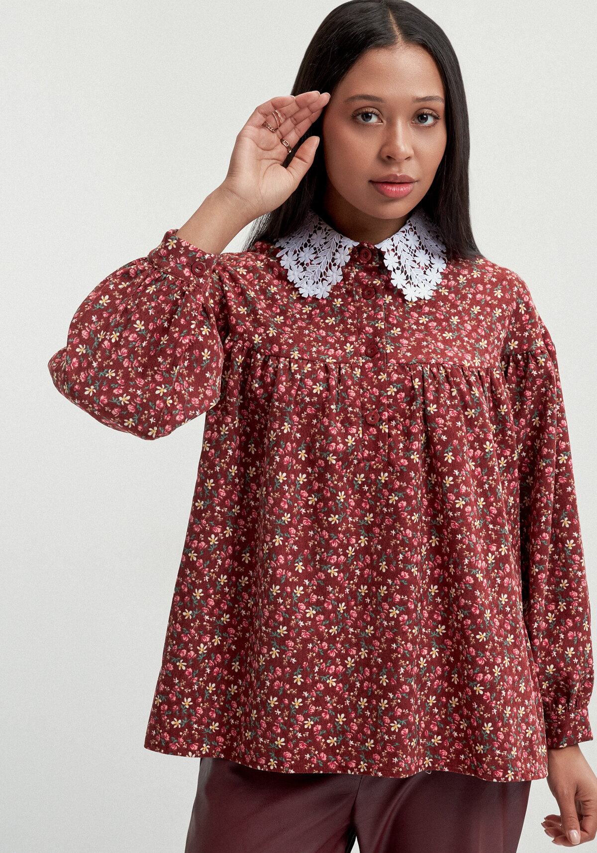 Блузка свободного кроя со спущенной линией плеча. На полочке и спинке фигурная кокетка. Сборка по верхнему краю полочки, спинки и рукаву. Впереди застежка-планка длиной до линии талии. Воротник отложной со стойкой. Воротник декорирован кружевным воротом. Рукава спущенные, объемные с манжетами по низу.