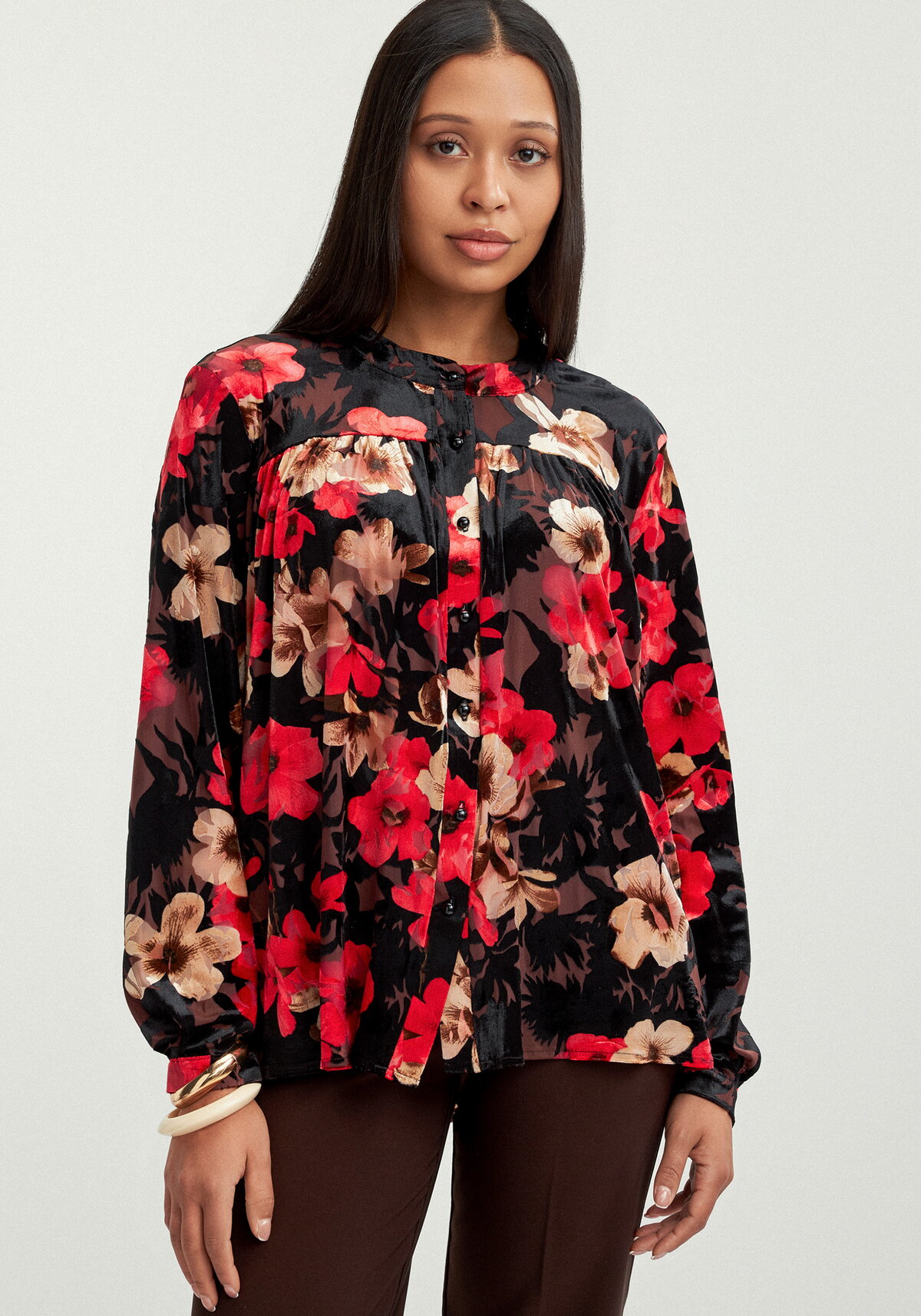 Эта модель — настоящий маст‑хэв в базовом гардеробе. Свободный крой обеспечивает комфорт в течение всего дня, а лежачая планочка на горловине придает изделию изысканный вид без излишней вычурности. Длинные втачные рукава с манжетами формируют аккуратный силуэт, а планка на пуговицах делает блузу практичной в носке. Сочетайте с юбками, брюками или джинсами — она впишется в любой стиль.