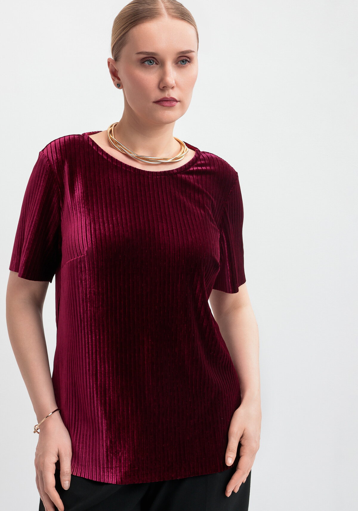 Элегантная блуза из плиссированного бархата. Модель с коротким рукавом и круглым вырезом. Свободный крой.