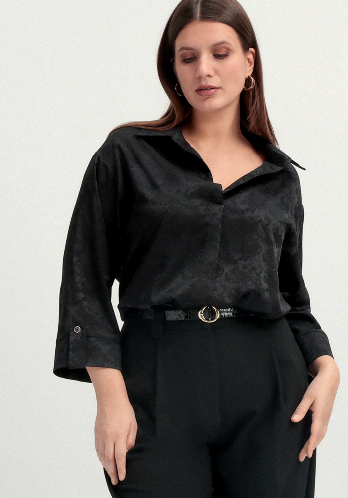 Блуза свободного кроя с рубашечным воротником. По низу блузы выполнен шнурок.