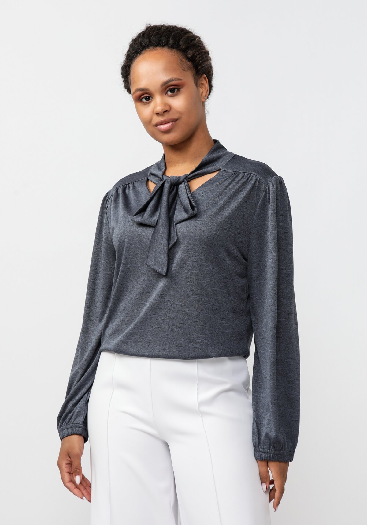 Эффектная меланжевая блуза с защипами на плечах и крупным бантом на воротнике. Комфортный длинный рукав на резинке. Модель одновременно может быть офисной, повседневной и торжественной. Сложные интересные расцветки. Свободный крой.