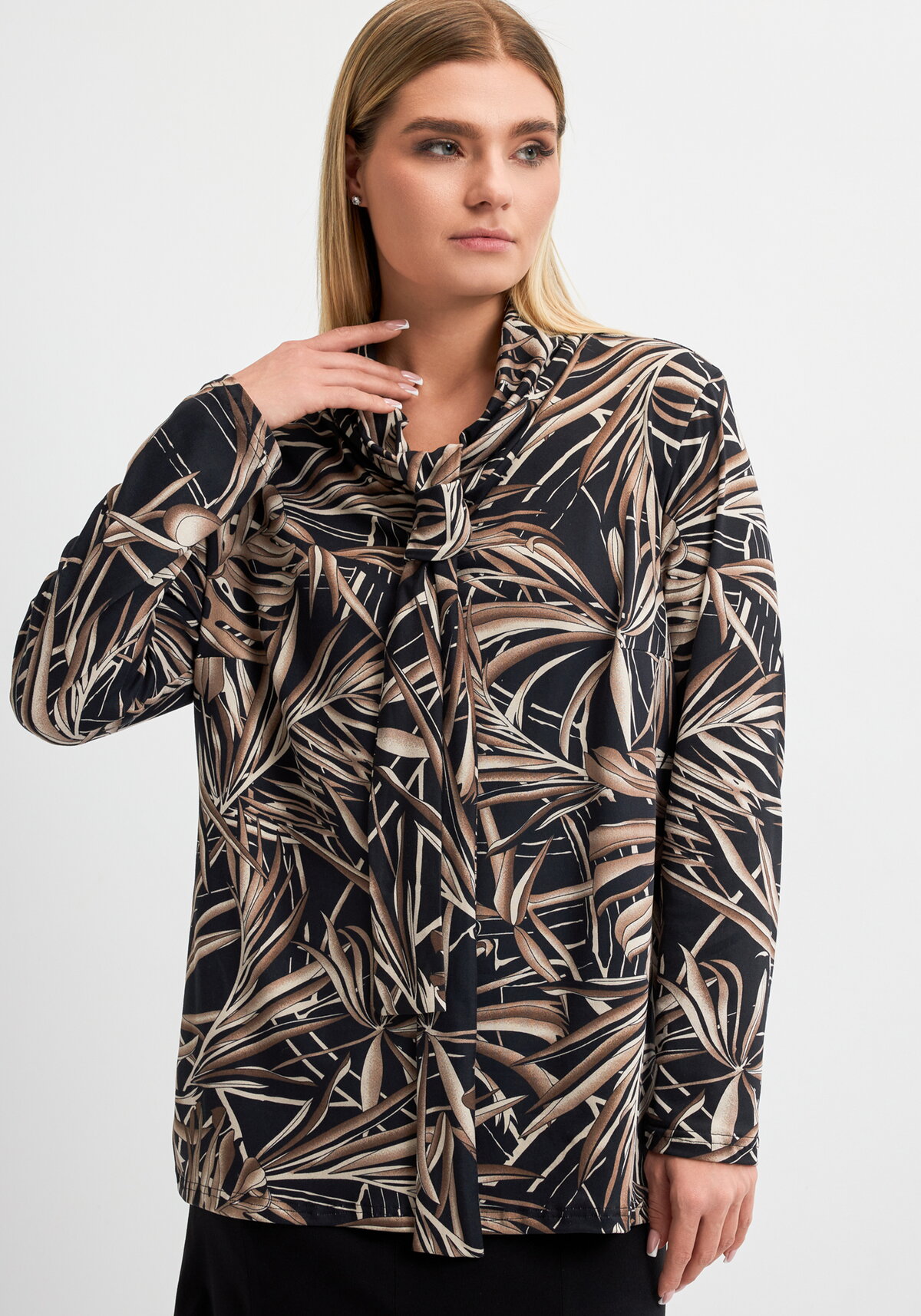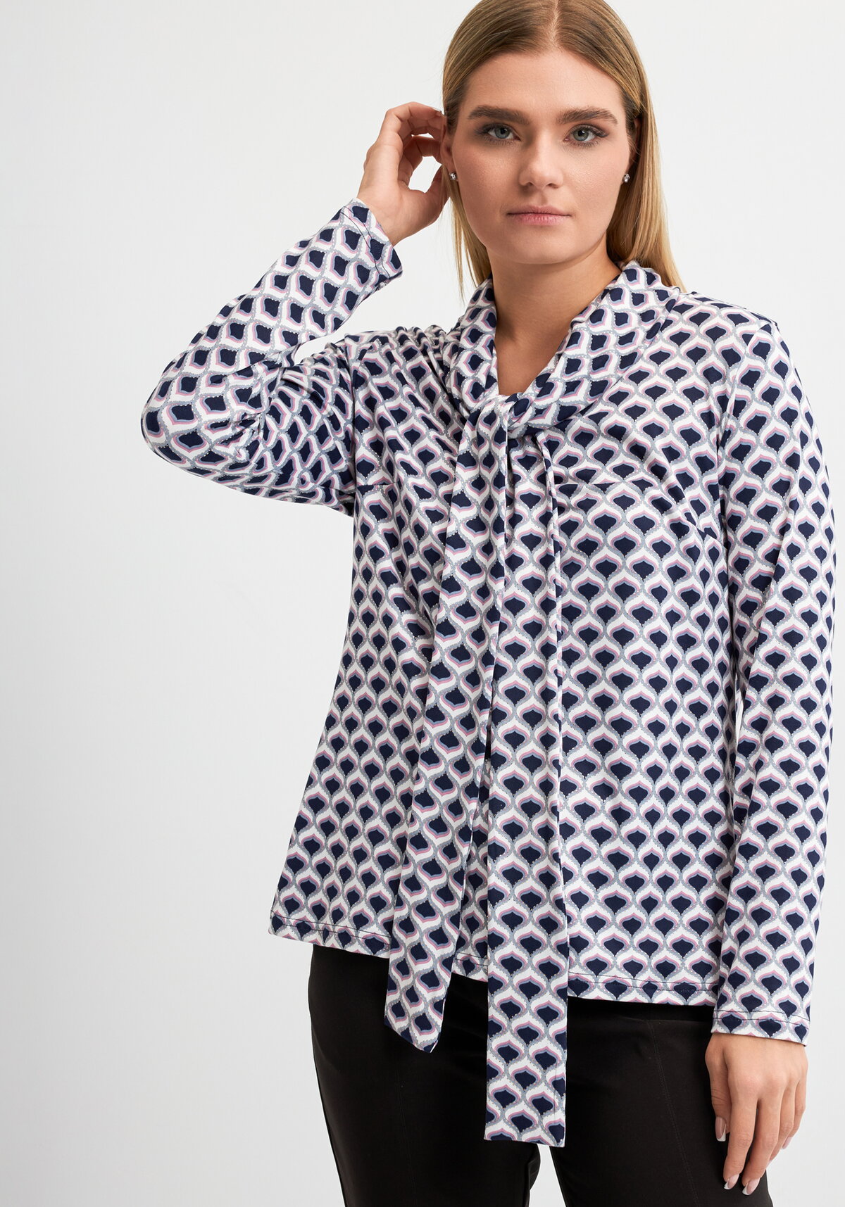 Блузка из мягкого трикотажного полотна масло-браш выполнена в полуприлегающем силуэте до линии бедер. Округлый вырез горловины украшен воротником-хомутом, к которому крепится съемный бант, добавляющий образу женственности. Длинный втачной рукав и приятная к телу ткань обеспечивают комфорт в течение дня.