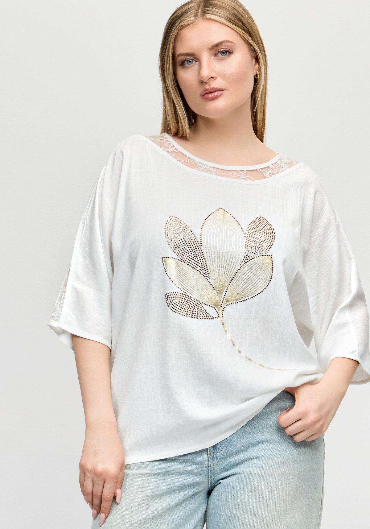 Очаровательная модель оверсайз из натуральной ткани (90% льна и 10% хлопка) сочетает комфорт свободного кроя с изысканными декоративными деталями — идеальный выбор для тех, кто ценит утончённый повседневный стиль. Спущенное плечо и цельнокроеный рукав «летучая мышь» создают непринуждённый силуэт, даря полную свободу движений и ощущение лёгкости. Нежный вырез «лодочка» с кружевной отделкой и кружевные вставки по низу рукавов добавляют образу романтичности, а аппликация из пайеток на груди деликатно мерцает при движении, притягивая восхищённые взгляды. Позвольте себе наслаждаться комфортом и элегантностью одновременно — эта модель станет любимой частью вашего гардероба!