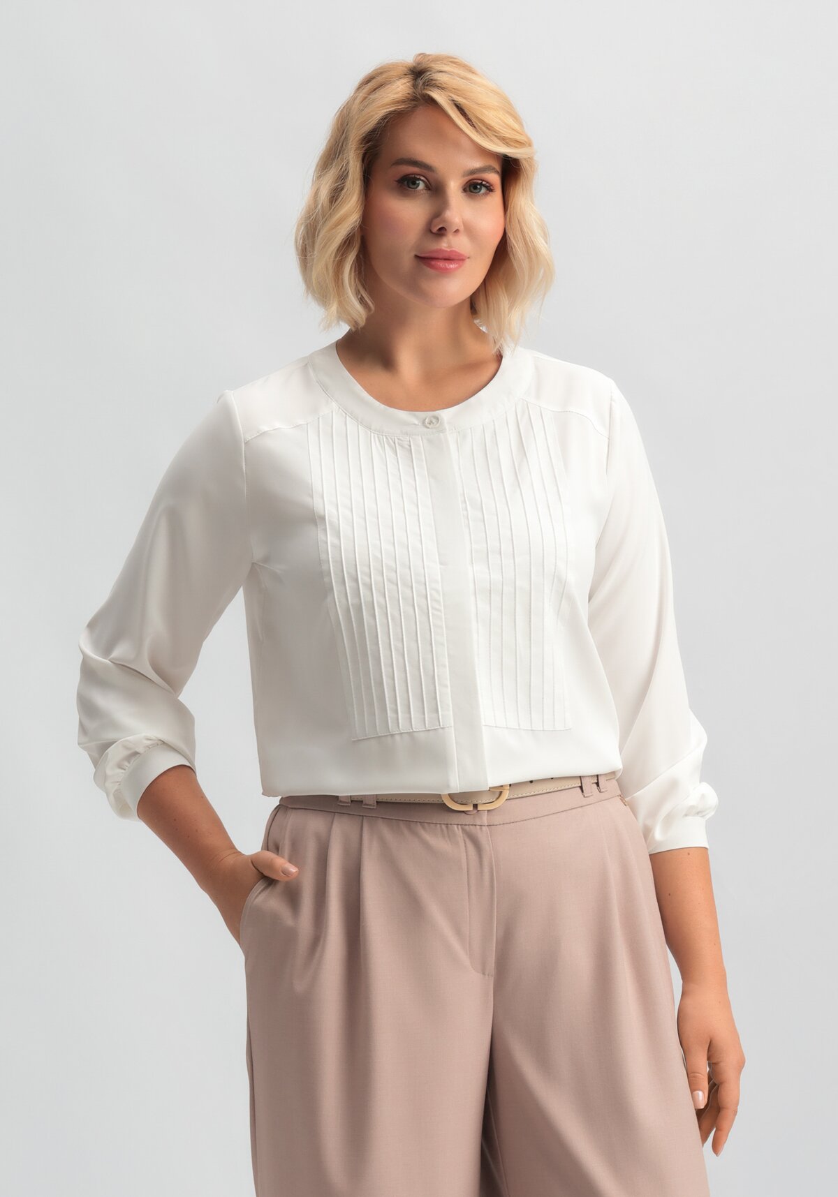 Блуза свободного кроя. Рукав длинный с отделочным манжетом. Горловина круглая. По переду планка на пуговицах и отстрочные запы по обе стороны планки. По плечу полочки имеется кокетка. Модель представлена в трех цветах: айвори, пудровый, темно-синий.
