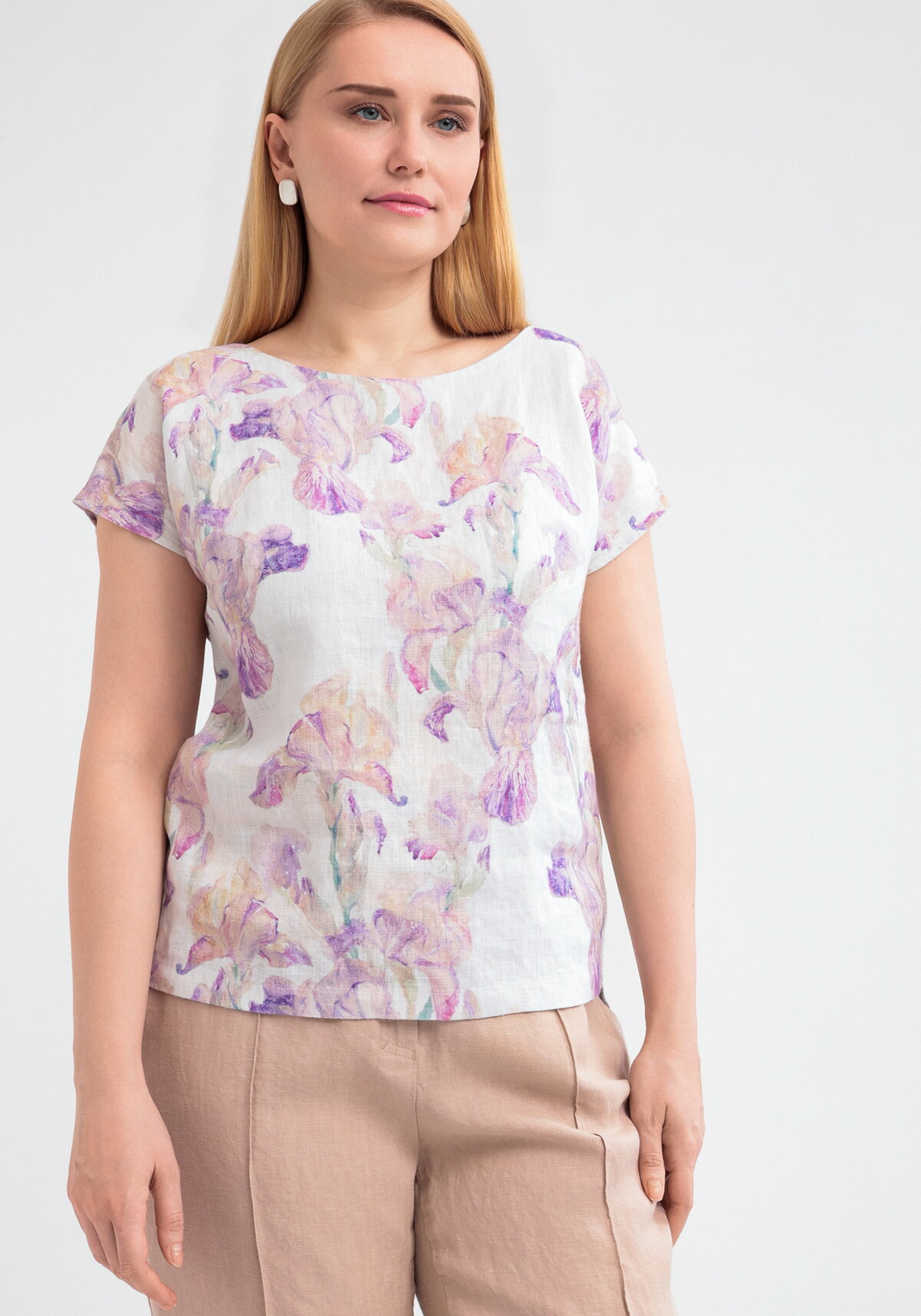 Блуза с коротким рукавом из 100% льна легко сочетается с другой одеждой. Большое разнообразие цветов: белый, цветы, черный, бежевый, молочный.