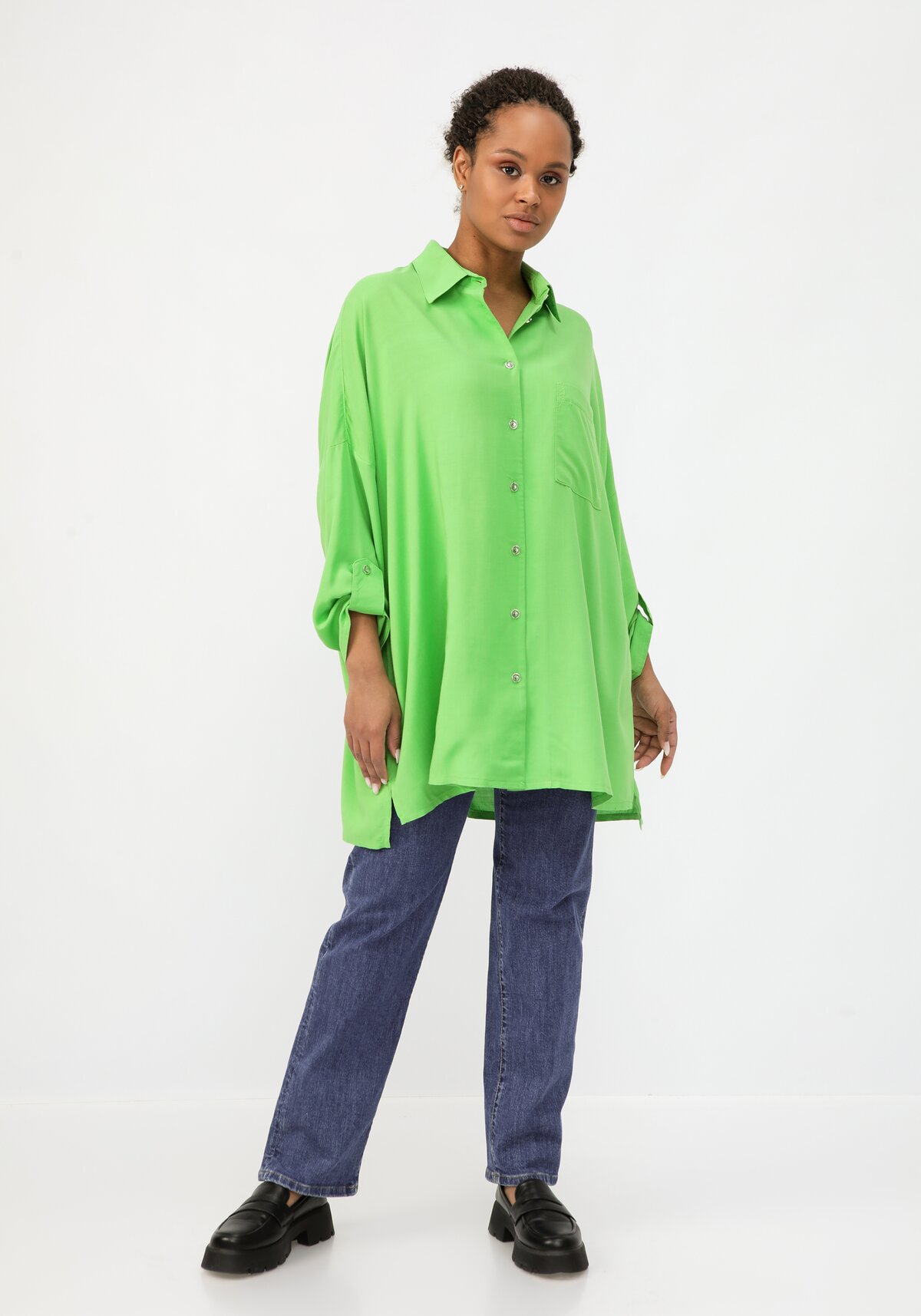 Стильная блуза свободного кроя с регулируемым рукавом. Удлиненная спинка. Разрезы по бокам для дополнительного комфорта. Хлопок и вискоза в составе. Блуза хорошо сочетается с брюками разного фасона. Двойные размеры.