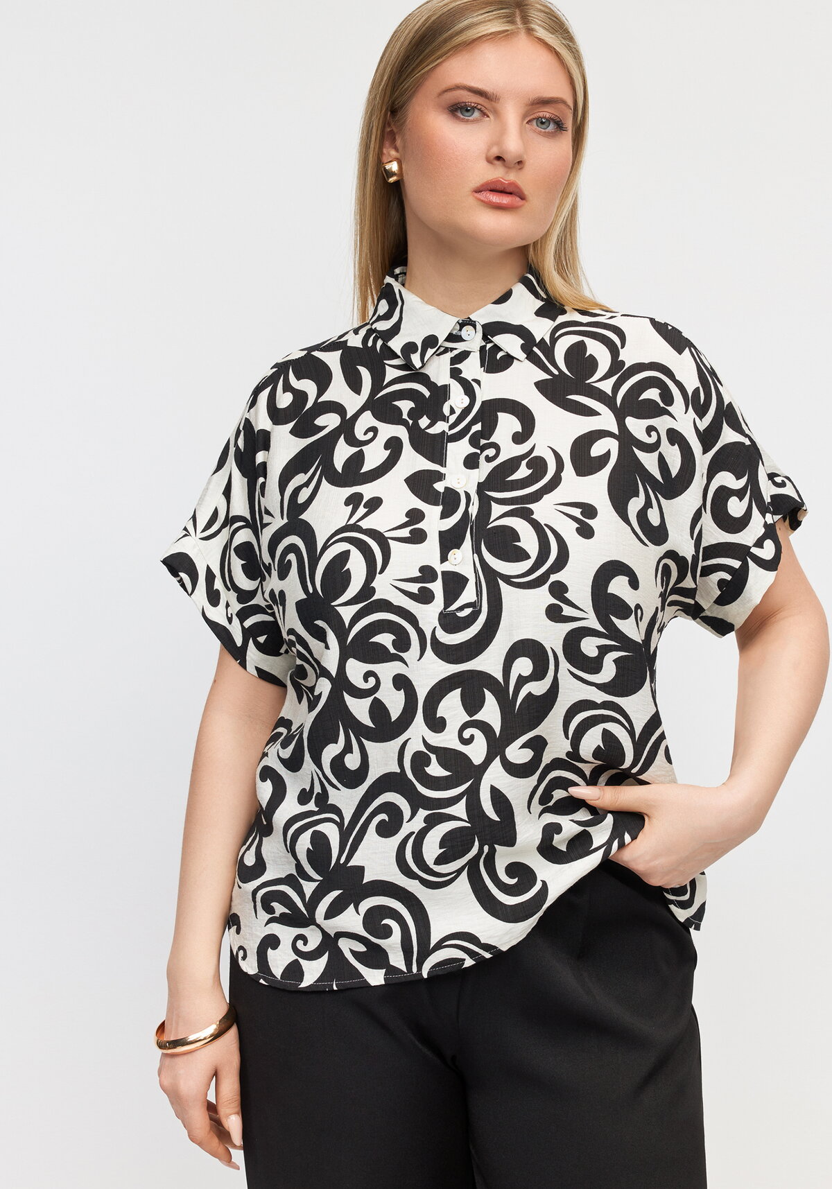 Лёгкая блуза из натуральной ткани (85% льна и 15% хлопка) подарит ощущение свежести и комфорта в жаркие дни — приятная на ощупь материя не подведёт на протяжении всего дня. Изящный рисунок оживит образ, а отложной воротник добавит ему особого очарования и выразительности, подчёркивая ваш неповторимый стиль. Универсальная модель со спущенным рукавом легко впишется в самые разные ансамбли — создайте десятки стильных летних луков с этой незаменимой вещью в гардеробе!