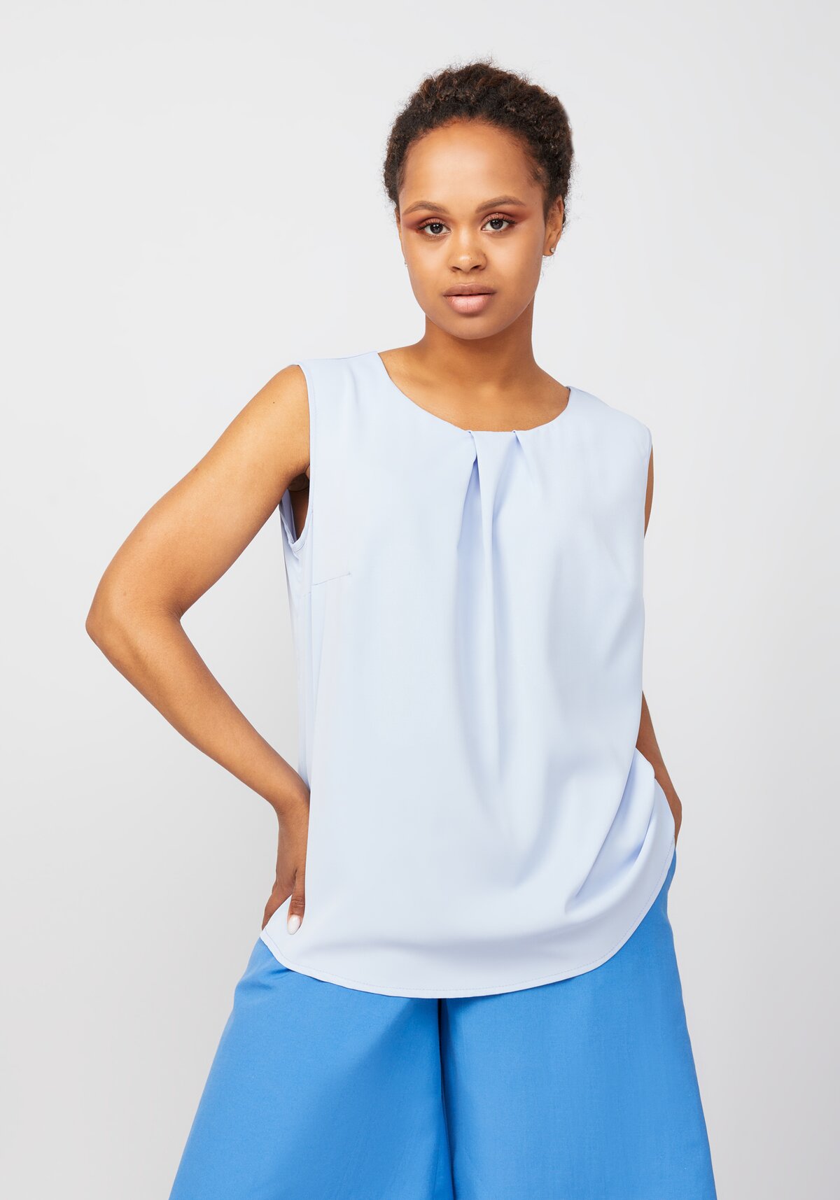Лаконичный однотонный топ свободного кроя с защипом по переду. Сочетается с низом разного фасона и позволяет создать множество стильных образов: деловых и повседневных. Вискоза в составе. Нежные пастельные расцветки.