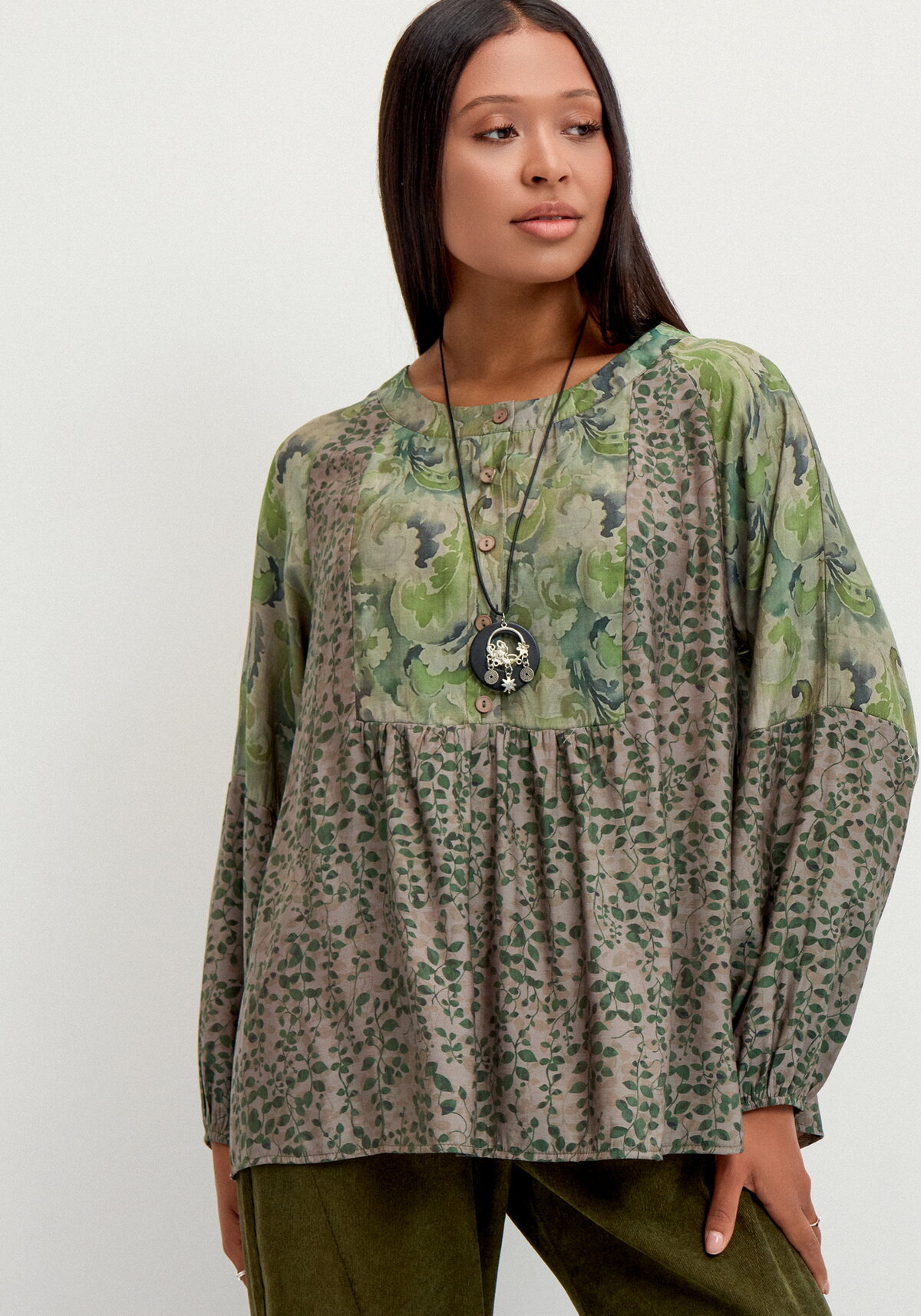 Блуза комбинированная свободного кроя. Кокетка на планке с застежкой на пуговицах. Рукав втачной полной длины, низ рукава на резинке. Модель представлена в двух цветах: зеленый и фиолетовый.