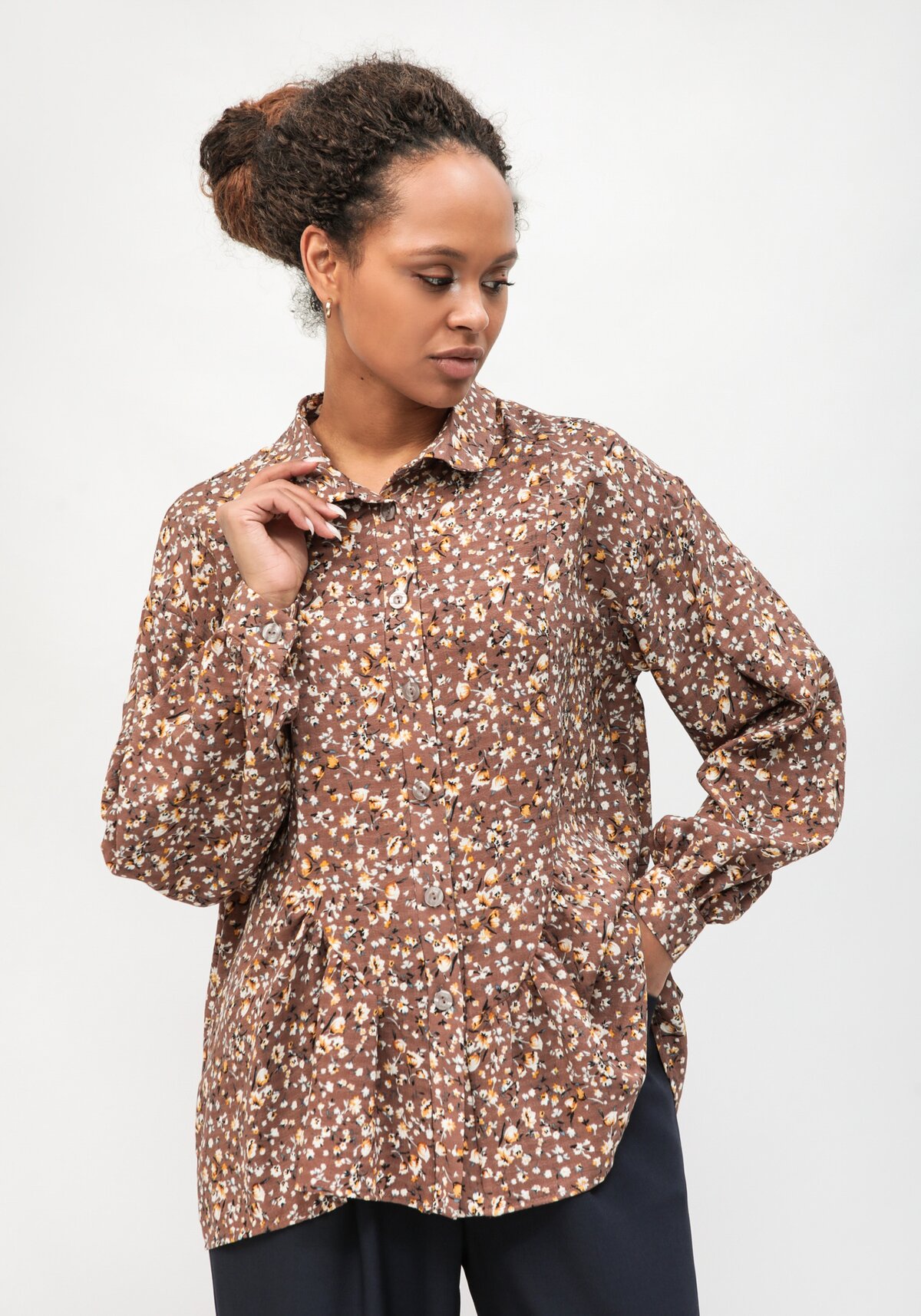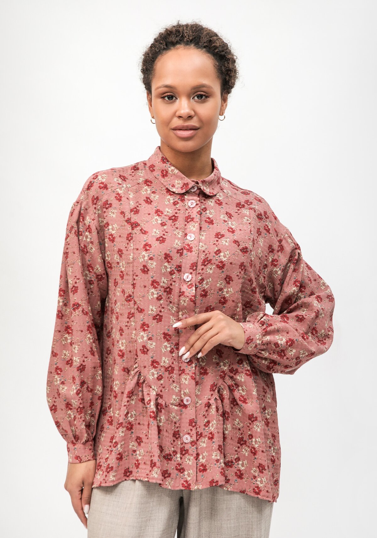 Блуза свободного кроя с цветочным принтом. Хорошо сочетается с широкими однотонными брюками для создания делового образа. Округлый воротничок на стойке, объемный спущенный рукав.