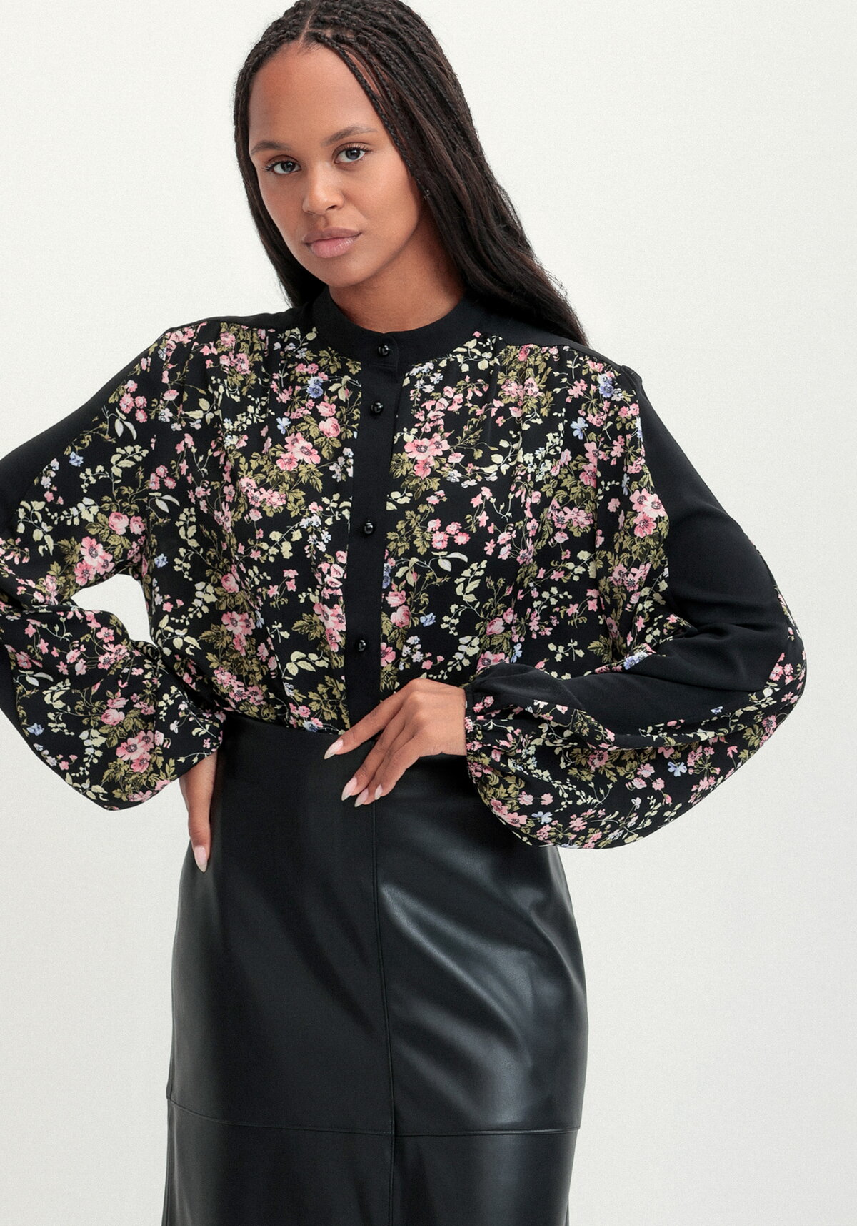 Комбинированная блуза свободного кроя с застёжкой на пуговицы и воротником-стойкой. Рукава полной длины на мягкой резинке создают лёгкий объём и обеспечивают комфортную посадку. Идеальна для офиса и повседневных образов.