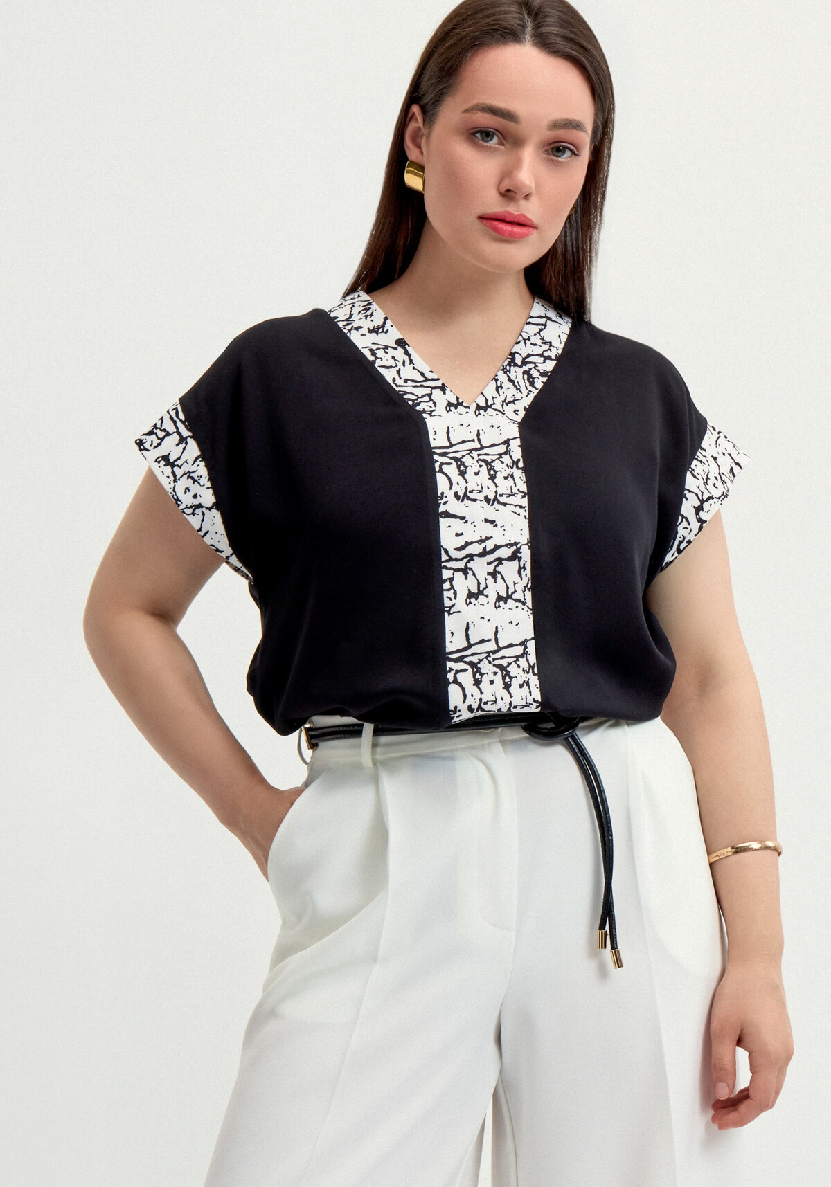 Блуза комбинированная, свободного прямого кроя и со спущенными плечами. По переду планка с V-образным вырезом горловины. Модель представлена в двух цветах: черный и белый.
