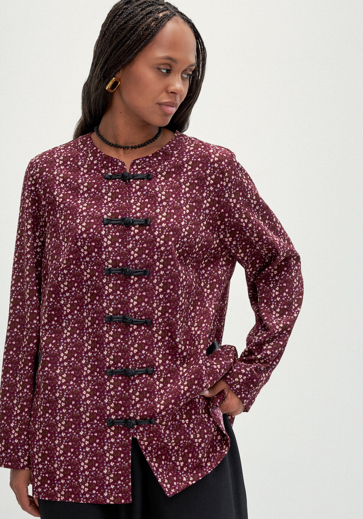 Блуза с оригинальными застежками на полочке и боковыми карманами. Длинный рукав с манжетами на пуговицах.