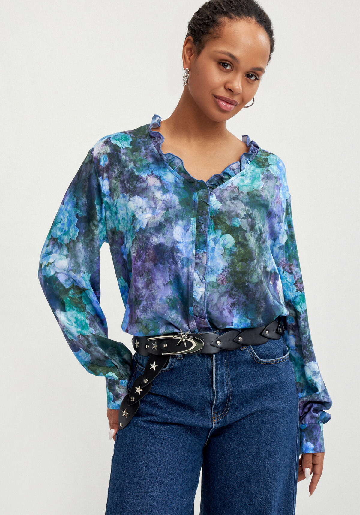 Свободная блуза в стиле оверсайз с элегантными деталями. Спущенная линия плеча и свободные рубашечные рукава с манжетами создают непринуждённый, но изысканный силуэт. V‑образный вырез горловины визуально вытягивает линию шеи, а потайная супатная застёжка придаёт модели лаконичность. Декоративная рюша, проходящая по борту и горловине, добавляет романтичный акцент в общий образ.