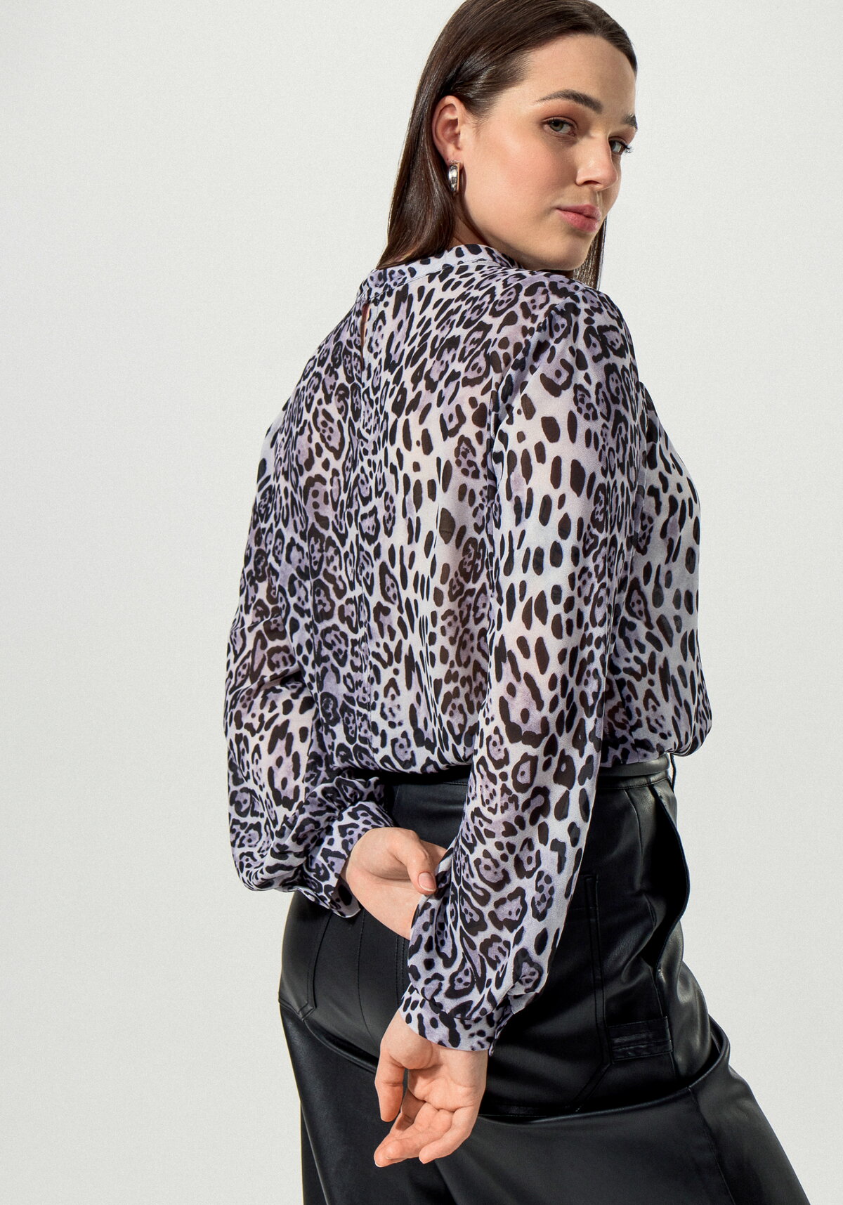 Блуза свободного кроя с воротником-стойкой. Застежка на пуговицу сзади по воротнику.