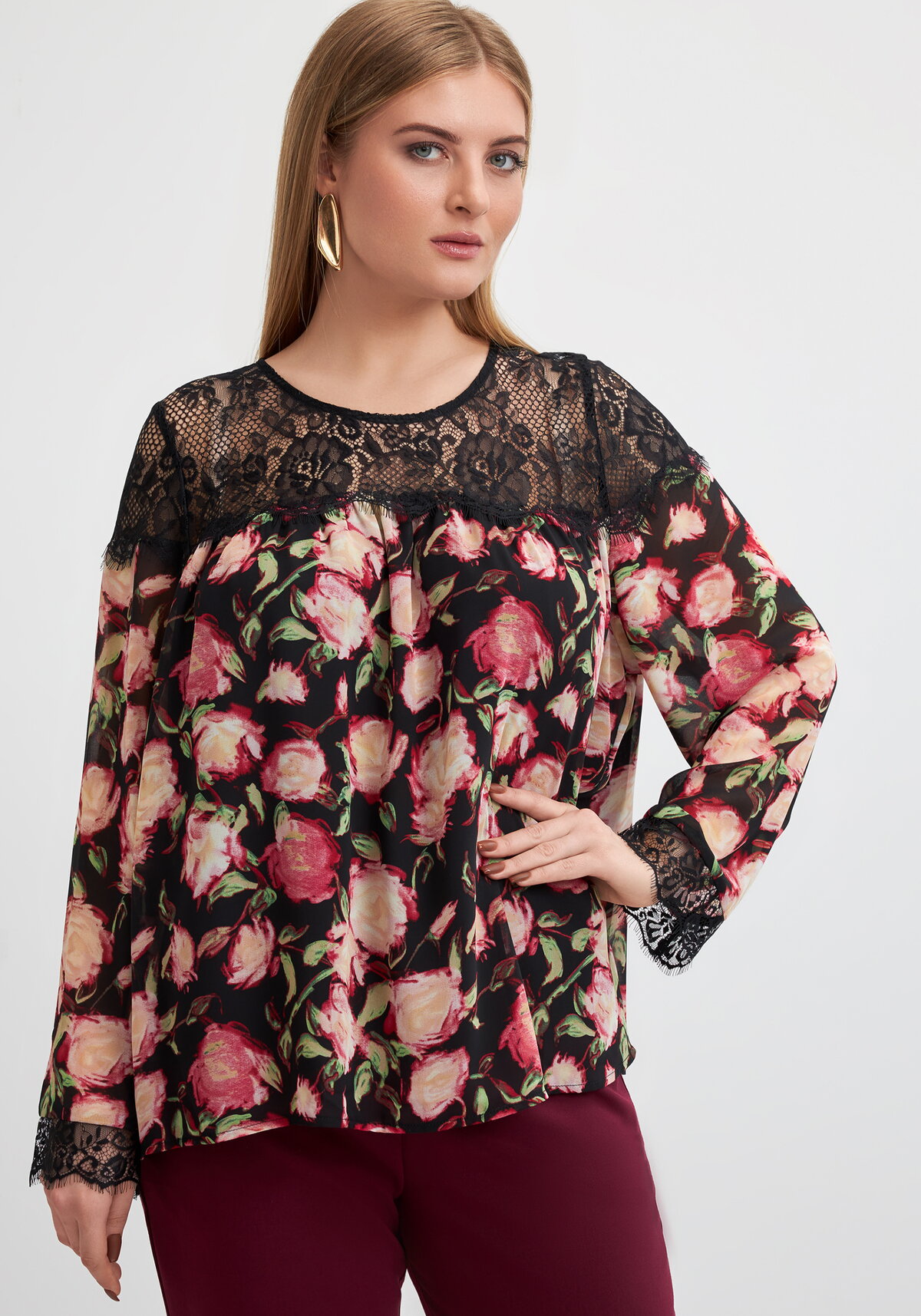 Комбинированная блуза на подкладе свободного кроя из шифона. Кокетка кружевная с фистонами. Рукав втачной полной длины с кружевными манжетами.