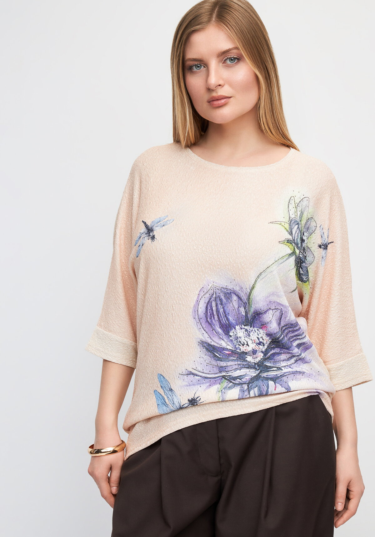 Блуза с цветочным принтом — женственный элемент летнего гардероба. Модель выполнена из смесовой ткани, сочетающей натуральную мягкость и практичность синтетики. Рукав 3/4, округлый вырез и свободный крой обеспечивают комфорт даже в жаркие дни. Яркий цветочный рисунок на нейтральном фоне добавляет свежести и настроения.