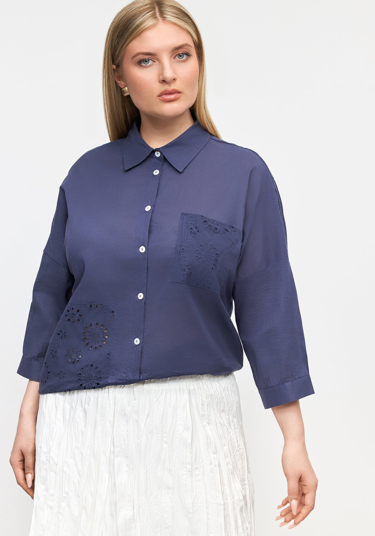 Изящная блуза с вышивкой в технике «Ришелье» на тонком хлопке очарует вас безупречной проработкой деталей и утончённым дизайном. Эффектный отложной воротничок и рукава длиной 3/4 создают игривый, но изысканный образ — он подчеркнёт ваш стиль и станет настоящей находкой для любого мероприятия. Комфортный крой и дышащая ткань обеспечат удобство на весь день, позволяя чувствовать себя уверенно и прекрасно.