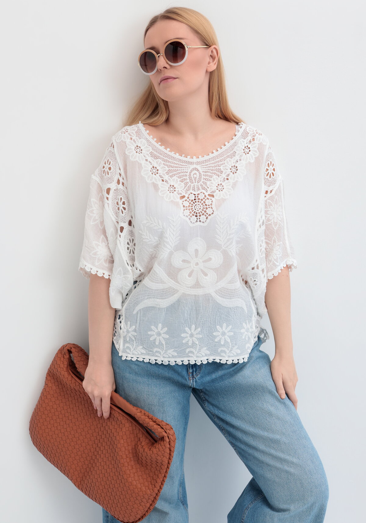 Блуза свободного кроя из 100% хлопка. Декорировано кружевным шитьем. Рукав 3/4, круглый вырез горловины. Модель представлена в пяти цветах: оранжевый, белый, голубой, фиолетовый, розовый.