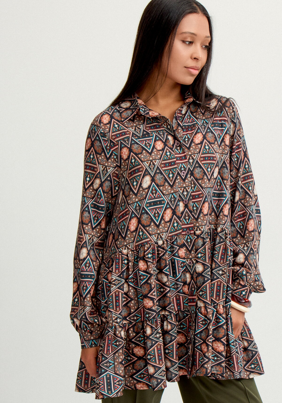 Блуза свободного кроя А-силуэта. Застёжка однобортная на пуговицы. Воротник отложной на стойке. Рукава рубашечные с манжетами. По низу блузы два отрезных волана на сборке.