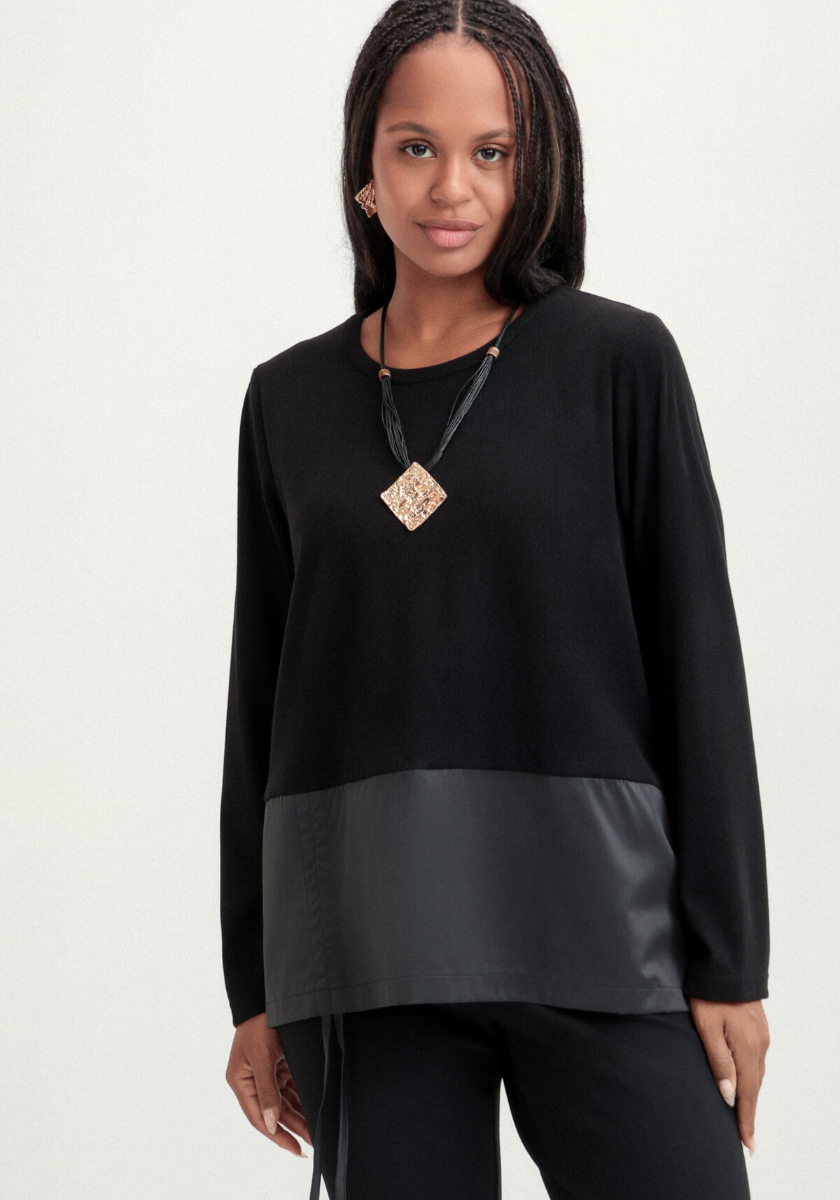 Блуза свободного кроя с декоративной вставкой по передней полочке на кулиске. Круглая горловина на планке и прямые рукава полной длины создают лаконичный и женственный силуэт.