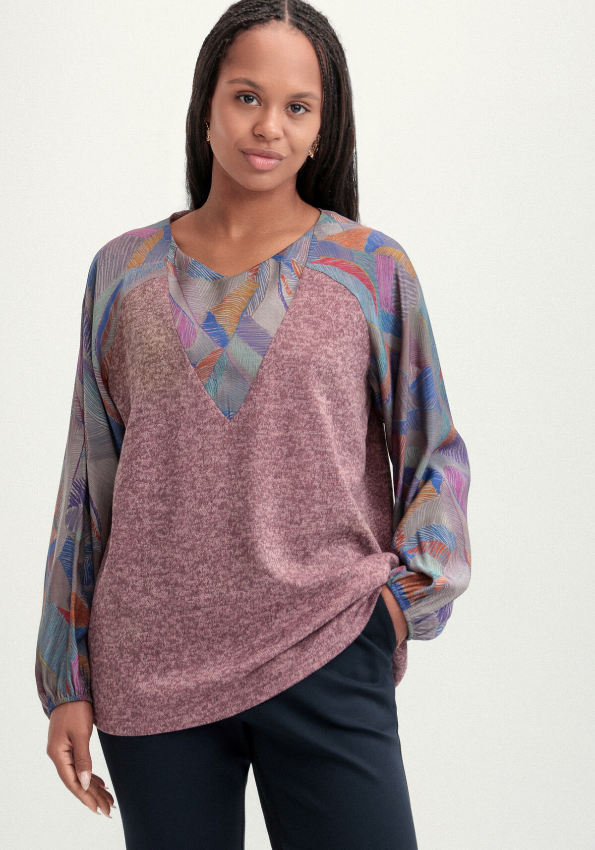 Комбинированная блуза свободного кроя с рукавом реглан полной длины на мягкой резинке. Горловина выполнена на обтачке. Легкая и удобная модель для повседневных и офисных образов.
