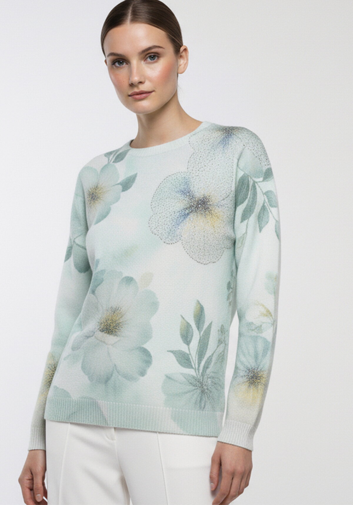 Блуза из нежного трикотажа подарит вам ощущение комфорта и уюта. Округлый вырез деликатно подчёркивает линию шеи, придавая образу женственности и мягкости. Цветочный принт наполняет модель весенним настроением и делает ее настоящим украшением гардероба — такая блуза легко превратит повседневный наряд в элегантный и романтичный.