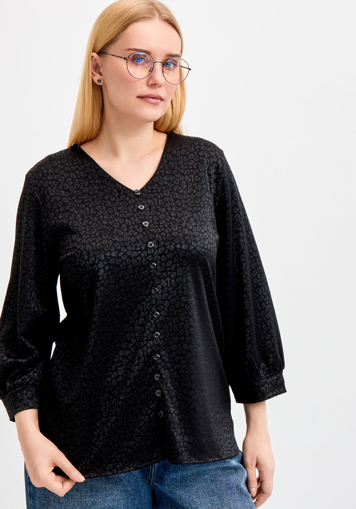 Блуза прямого кроя с эффектным леопардовым принтом. Модель с рукавом 7/8 на манжете и V-образным вырезом подчёркивает женственность и стиль. Декоративные пуговицы добавляют изящные акценты, делая образ выразительным и современным.
