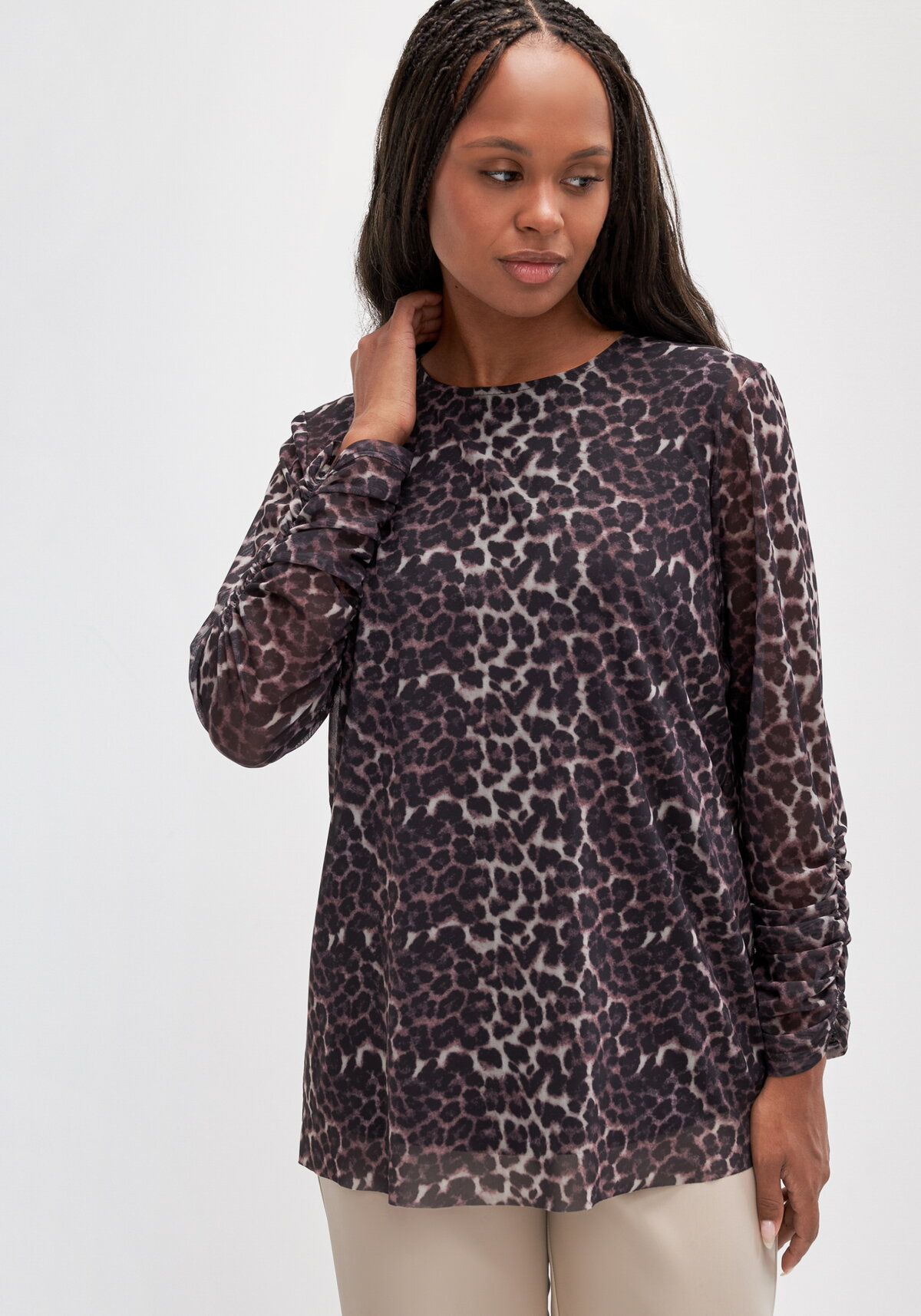 Блуза из эластичного трикотажа. На эластичном подкладе, длинный рукав с эластичной сборкой, длина изделия до бедер. Для повседневного и праздничного гардероба.