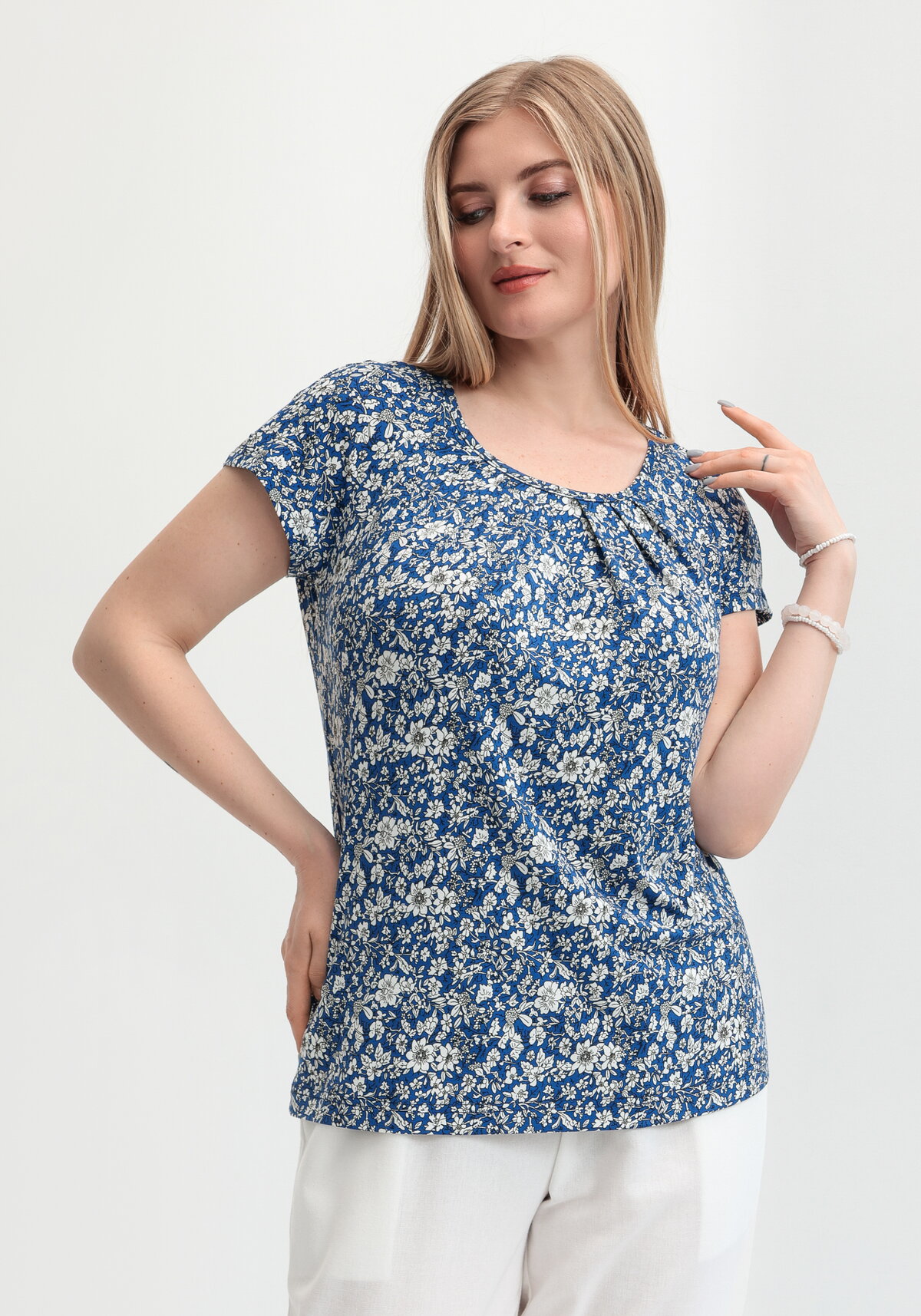 Блузка полуприлегающего силуэта с коротким рукавом-реглан и круглым вырезом горловины с защипами под окантовку. Выполнена из вискозы и эластана. Модель представлена в трех цветах: синий, зеленый, голубой.