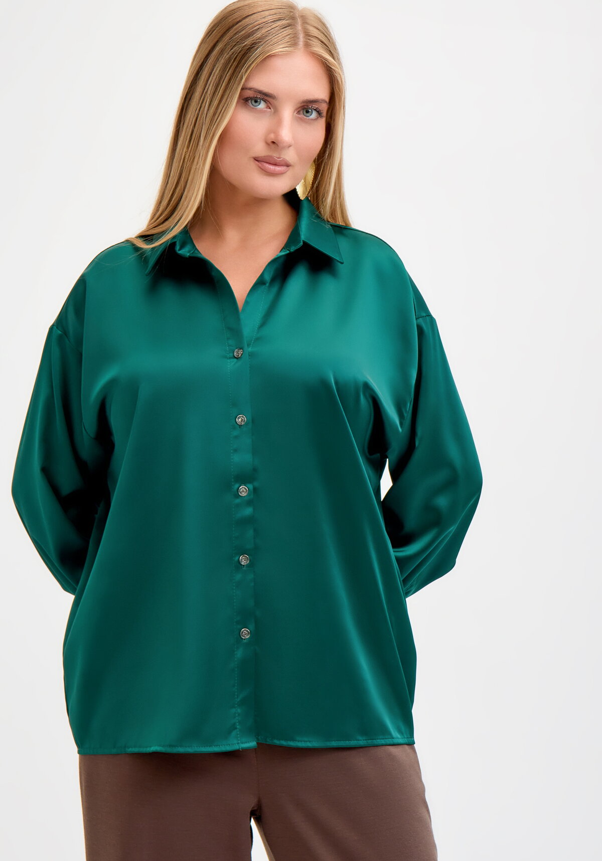 Блузка рубашечного типа. Полочка с застежкой на пять пуговиц. Отложной ворот. Модель представлена в четырех цветах: зеленый, бордовый, коричневый, кремовый.