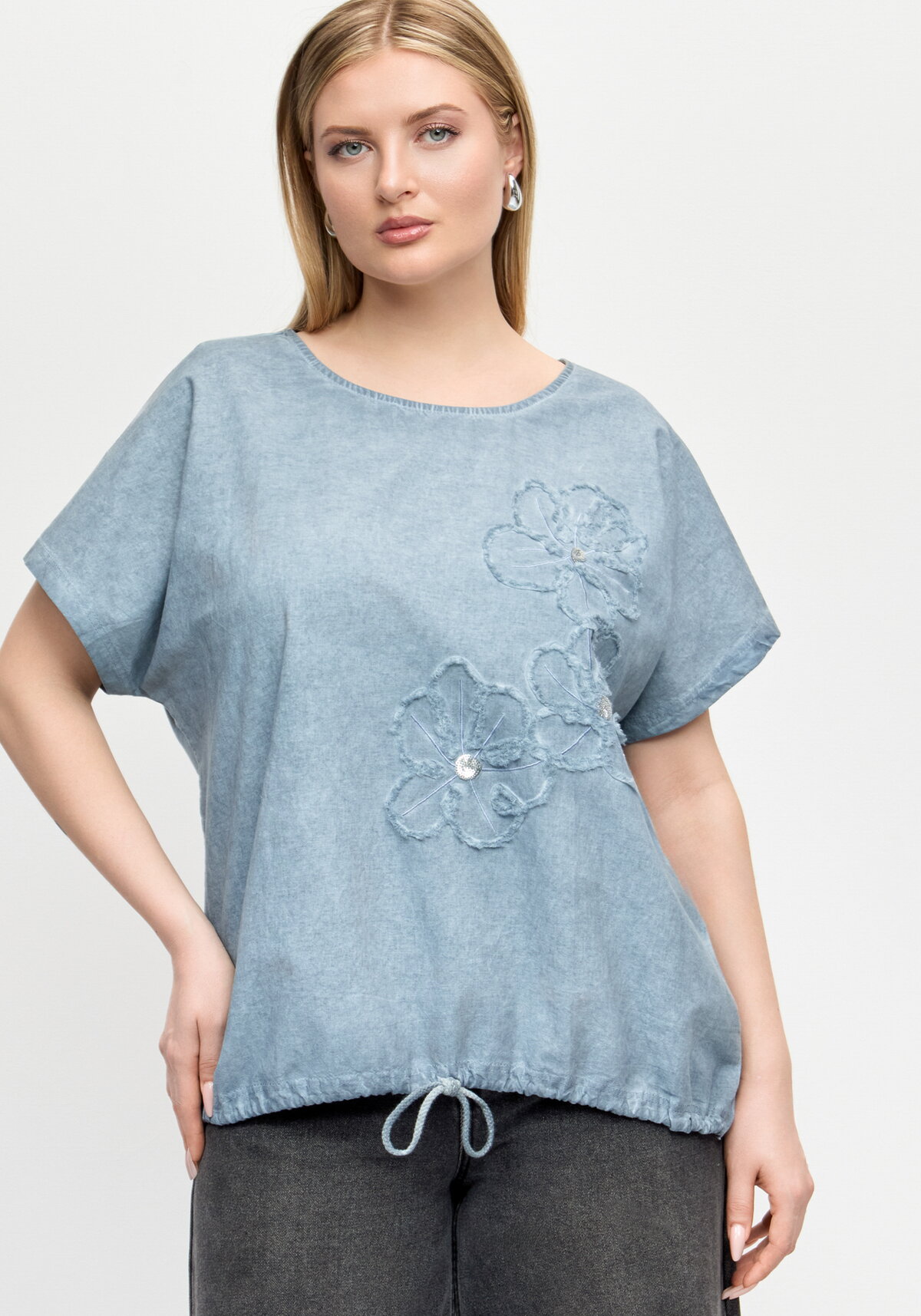 Свободная блуза с круглым вырезом и спущенным плечом подарит вам непревзойдённый комфорт и позволит создать непринуждённый, но стильный образ на каждый день. Цельнокроеный рукав и кулиска со шнуром по низу модели дают возможность регулировать силуэт — подчеркните талию или оставьте крой максимально расслабленным. Изысканная аппликация в виде цветка с пайетками на груди станет эффектным акцентом, деликатно мерцающим при движении и притягивающим восхищённые взгляды. Эта блуза — идеальное сочетание лёгкости, элегантности и игривого шарма, которое добавит яркости любому вашему луку!