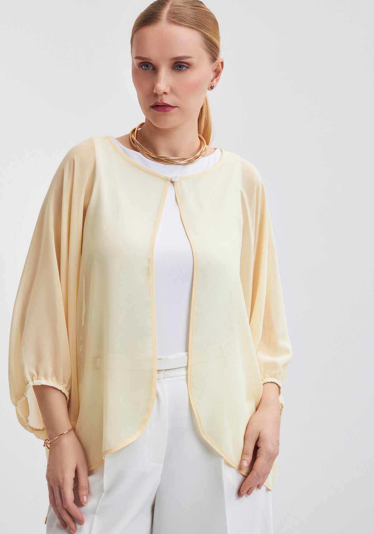 Легкое шифоновое болеро — стильная деталь, которая сделает образ нежным и женственным! Модель имеет прямой свободный крой с рукавами длиной 3/4. Застегивается на пуговицу у горловины. Воздушная накидка сшита из тонкого и красивого струящегося шифона, создающего эстетичную драпировку.