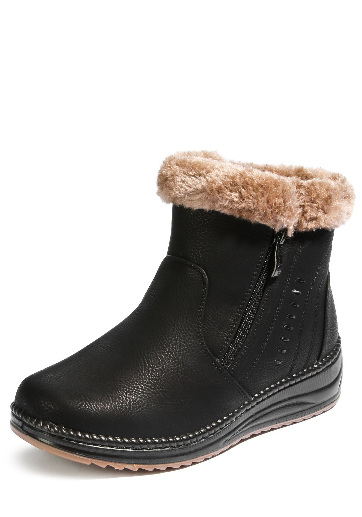 Ботинки сочетают в себе практичность и стиль. Подкладка из искусственного меха поддерживает комфортную температуру. Зимняя модель с двумя молниями по бокам легко надевается.