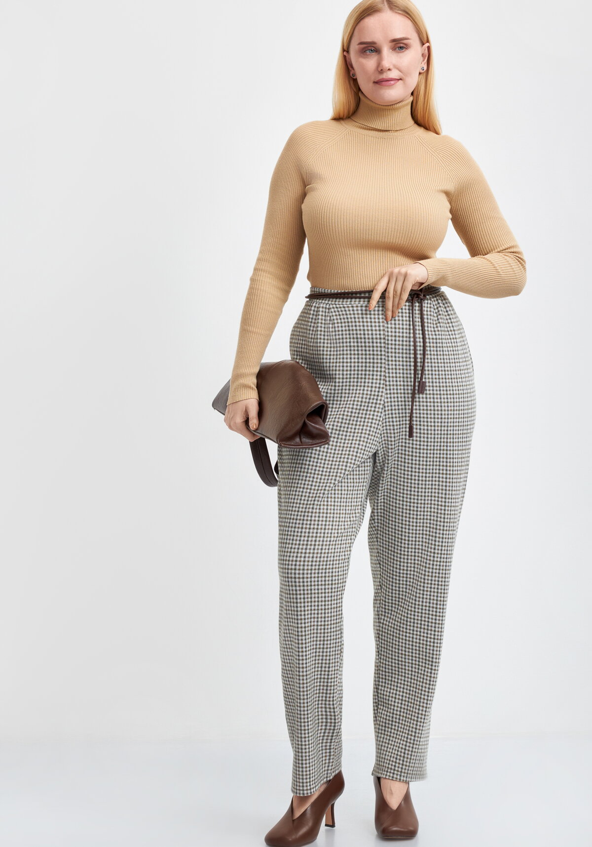 Брюки с карманами в боковых швах. На передних половинках по верхнему срезу заложены по 3 односторонние складки. Пояс притачной по полочке, на задней половине цельнокроеный пояс на резинке. Низ брюк обрабатывается швом в подгибку. Модель представлена в двух цветах: хаки и серый.
