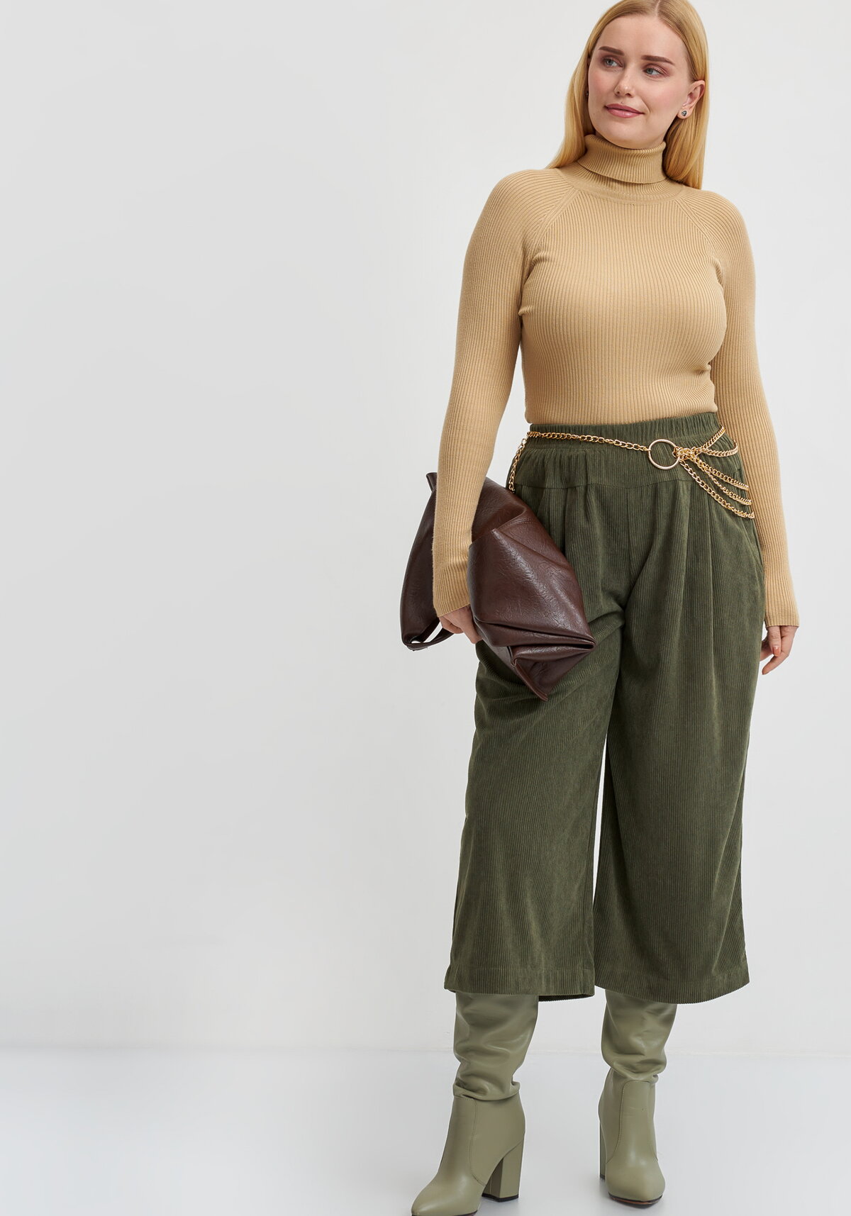 Брюки свободного кроя с защипами по переду из-под отрезной кокетки, внутренние карманы по переду, длина 7/8. Широкая эластичная резинка по талии. Ткань вельвет.