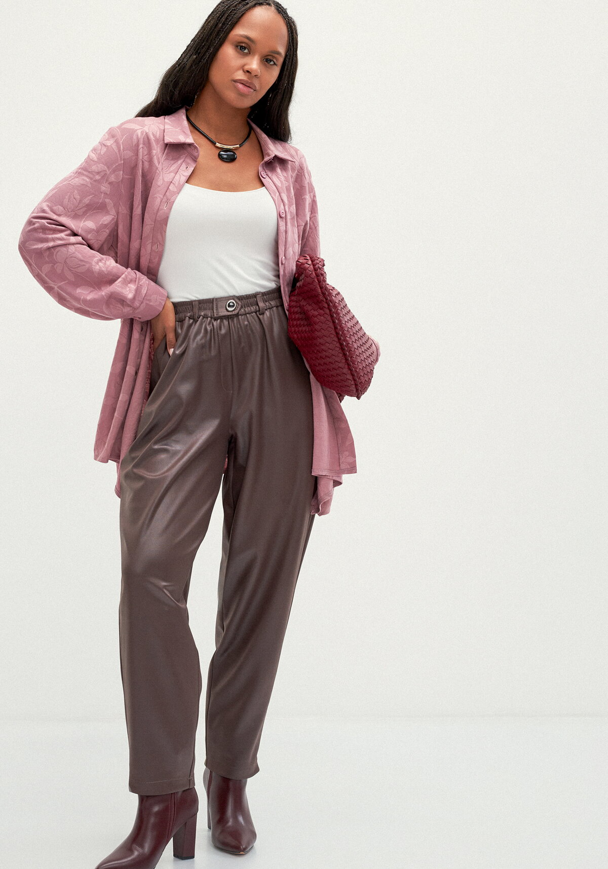 Брюки бананы с глянцевым напылением. Застегиваются на молнию и пуговицу.