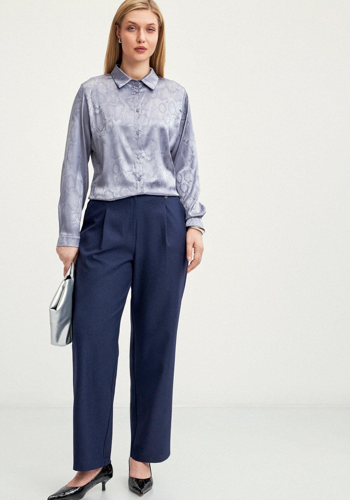 Брюки свободного силуэта отличаются умеренной шириной книзу и прямым силуэтом. На передней полочке эффектно смотрится глубокая складка, начинающаяся от стабильного пояса, задняя часть которого выполнена на резинке для лучшей посадки. Дополняют модель шлевки с фирменными фишечками, а также функциональный гульфик.