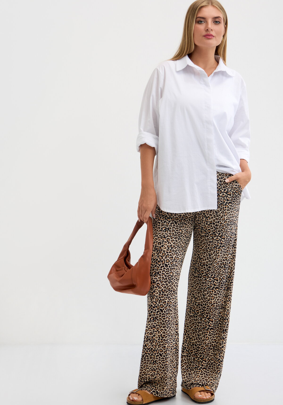 Брюки свободного силуэта полной длины. По бокам карманы.