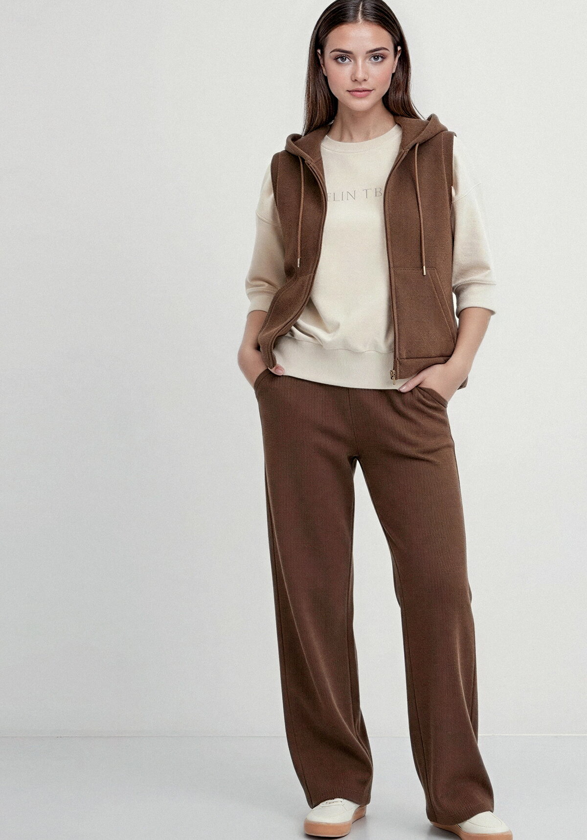 Брюки из микровельвета с начесом обеспечивают приятное ощущение тепла и комфорта. Прямой крой и средняя посадка создают лаконичный силуэт, а эластичный пояс гарантирует удобную фиксацию на талии. Впереди расположены функциональные карманы с "листочкой", которая выполнена из рибаны — это добавляет изделию практичности и аккуратности. Мягкая фактура материала и продуманные детали делают эти брюки отличным выбором для повседневной носки.