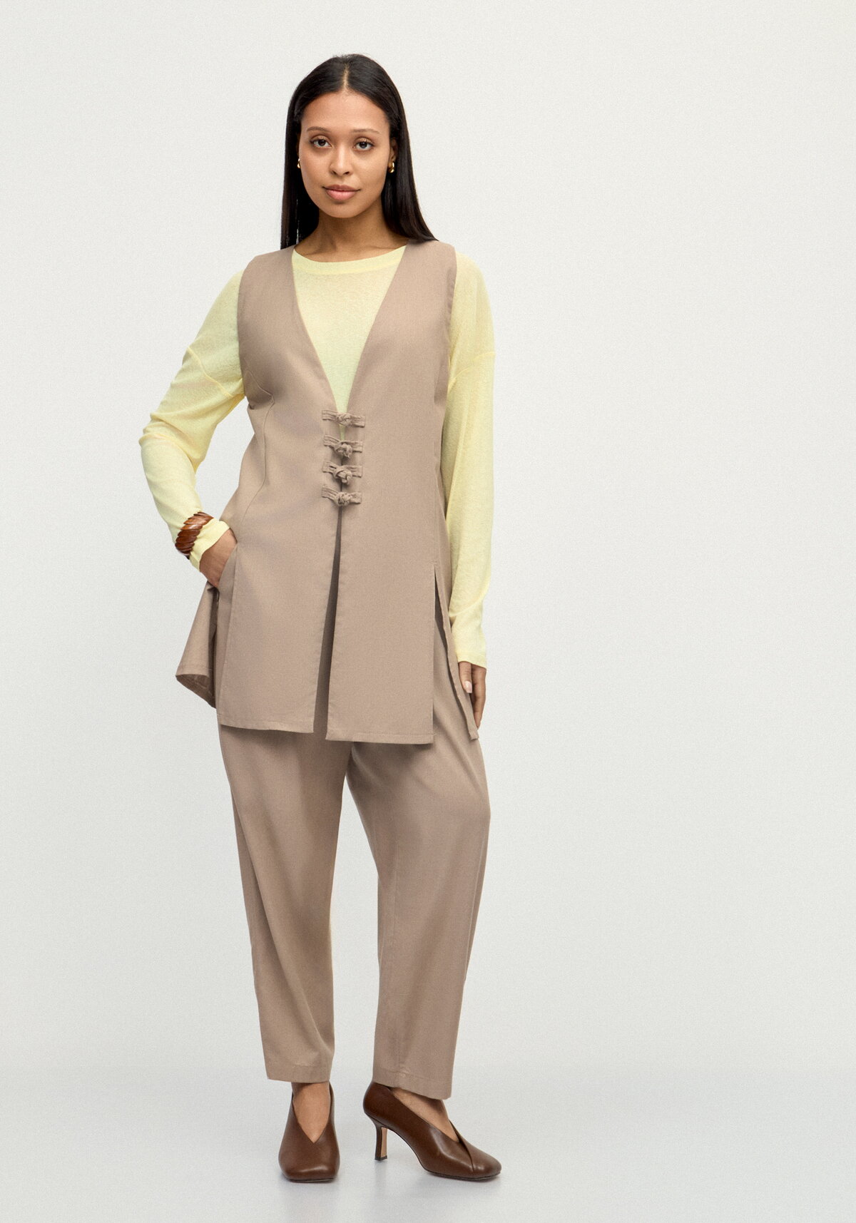 Откройте для себя комфорт и стиль с элегантными брюками из натуральной ткани с добавлением льна — идеальным выбором для модных и практичных образов! Удобный пояс на резинке гарантирует свободу движений и абсолютный комфорт в течение всего дня, а два функциональных кармана делают модель ещё более практичной. Изысканный зауженный крой подчёркивает силуэт, деликатно вытягивая силуэт и добавляя образу утончённости. Лёгкая льняная ткань приятно ощущается на коже и позволяет чувствовать себя уверенно в любую тёплую погоду. Сочетайте эти брюки с блузами, топами или рубашками — и создавайте безупречные ансамбли на каждый день!