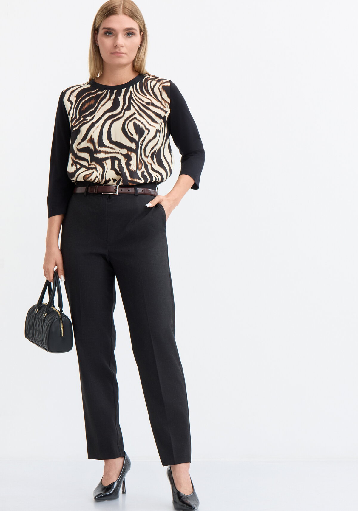 Классические зауженные брюки со стрелками. Выполнены из мягкой костюмной поливискозы. Модель с притачным поясом со шлевками под ремень, сзади вставлена резинка. Застежка – гульфик на молнии, пуговица. Базовая модель брюк дополнит деловой гардероб в сочетании с классическими рубашками и джемперами.