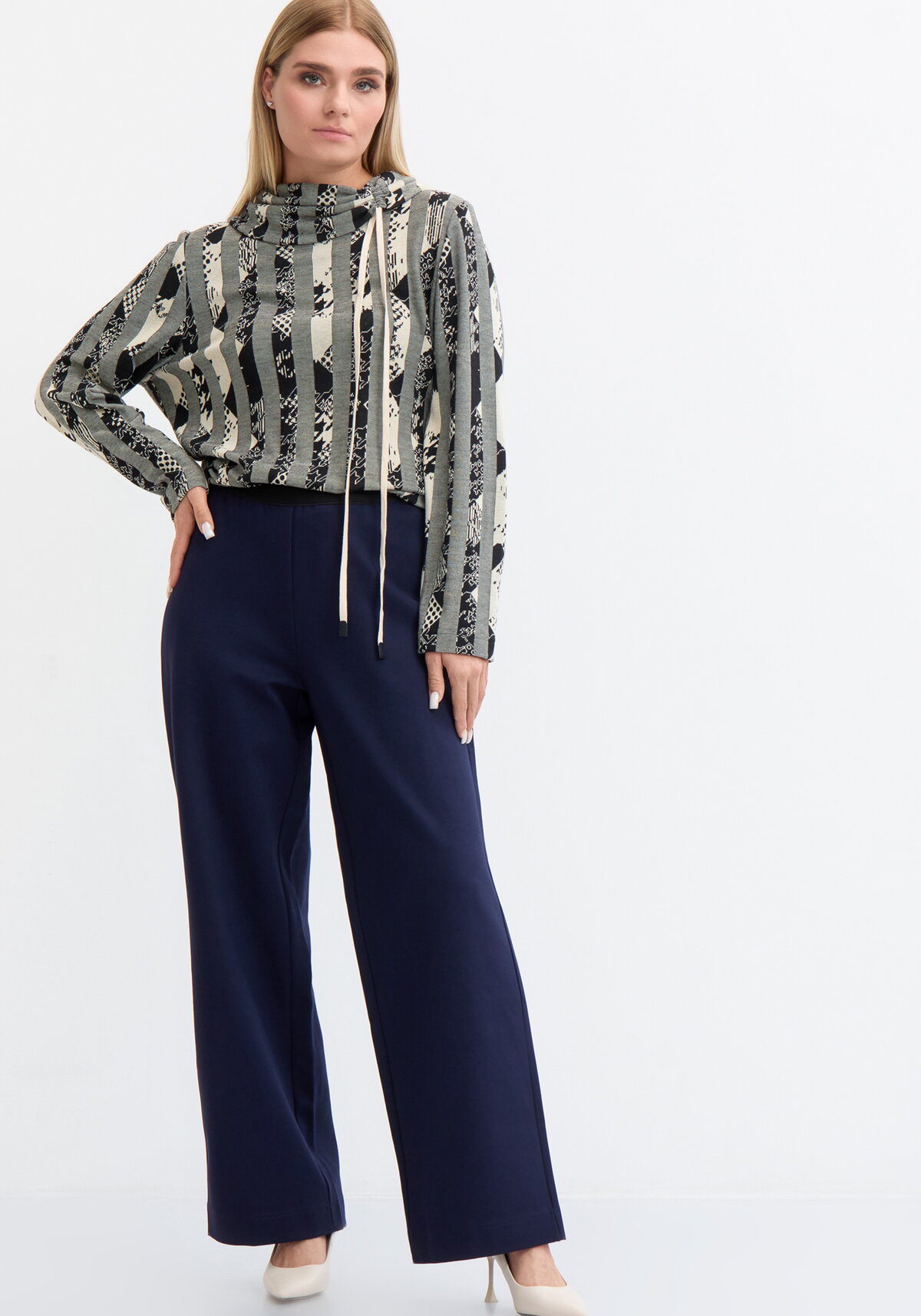 Широкие брюки на эластичном поясе. Модель имеет прорезные боковые карманы.