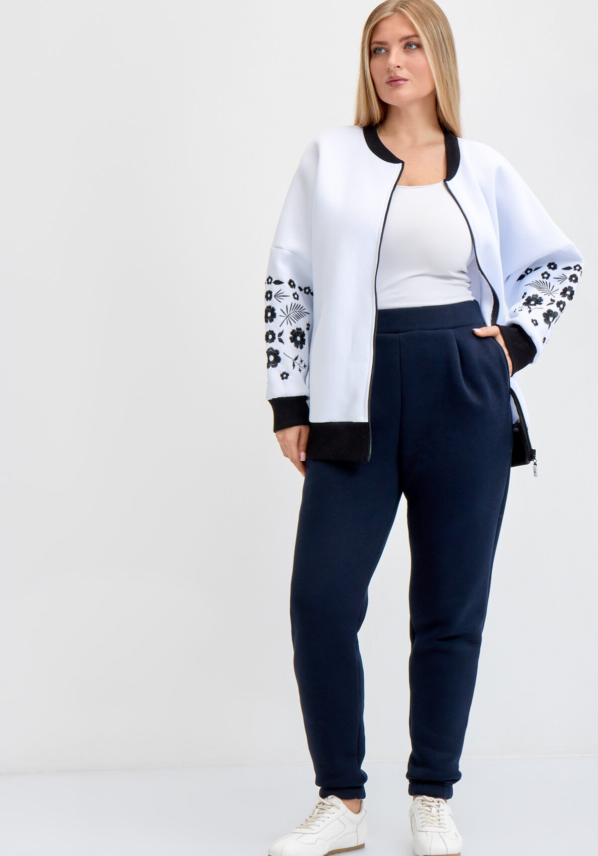 Зауженные к низу брюки. Низ обработан резинкой, что создает небольшую сборку. В боковых швах карманы. Пояс на широкой резинке. На передних половинках заложены односторонние складки по верхнему срезу.